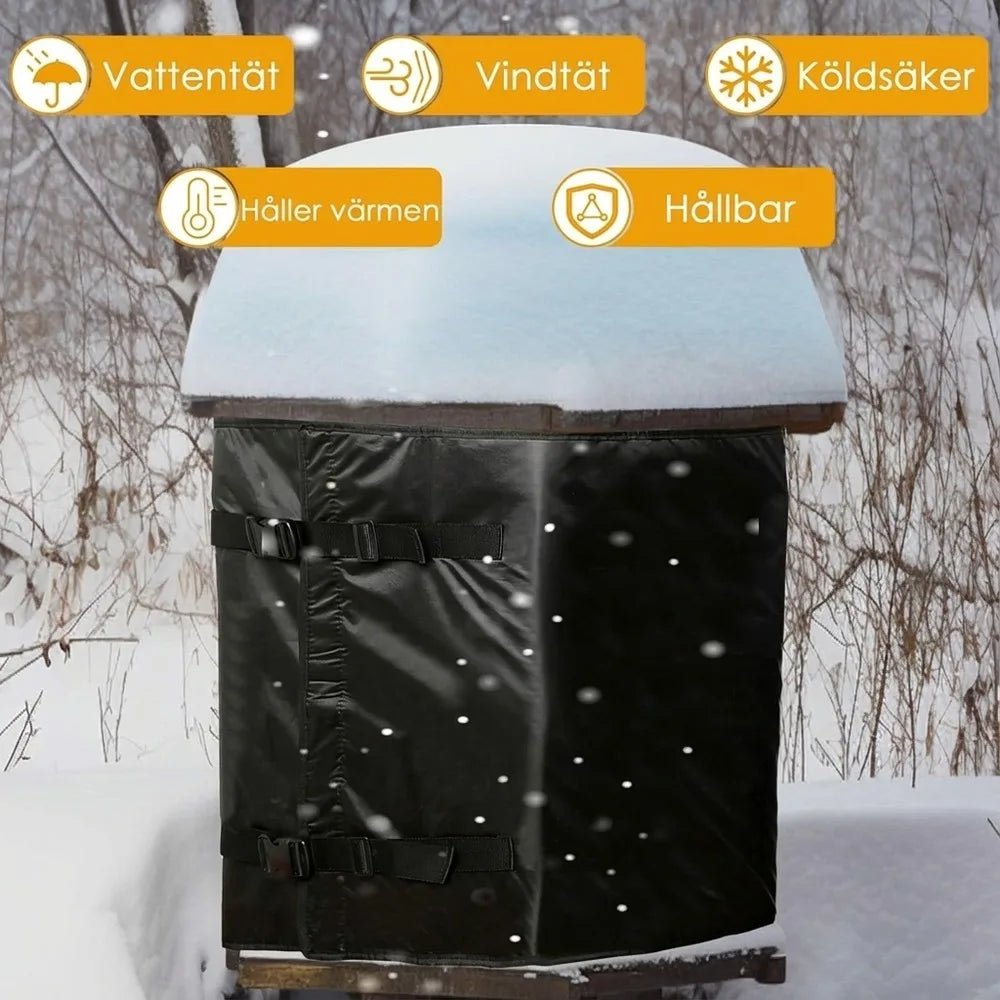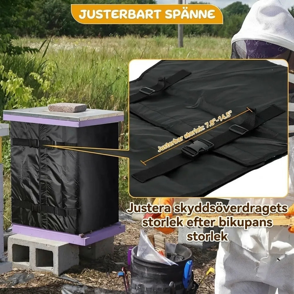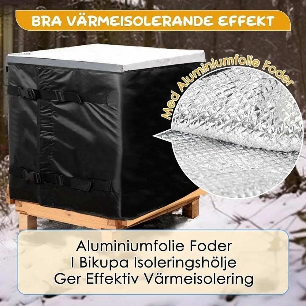 Isoleringsöverdrag för bikupa som omsluter kupans sidor och hjälper till att blockera vind samt minska värmeförlust under kalla perioder. Insidan har aluminiumfoliefoder som reflekterar värme tillbaka mot kupan och ger ett extra isolerande lager vid övervintring. Yttertyget i slitstark 600D Oxford skyddar kupans utsida mot väderpåverkan. Överdraget träs runt kupan och spänns fast med justerbara band för att sitta stabilt även i blåst. Passar som säsongsskydd under höst, vinter och tidig vår.