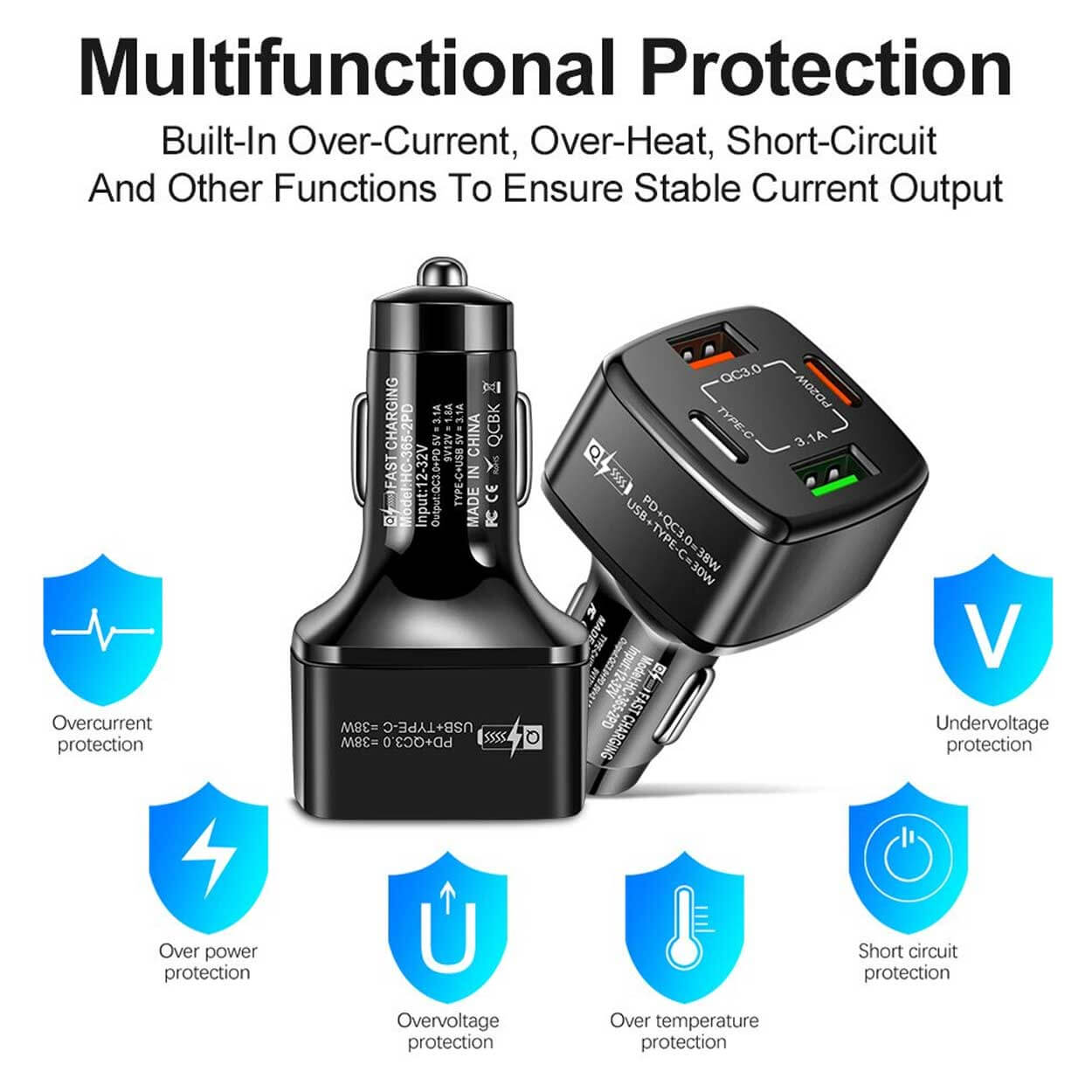 Billaddare 4 USB – snabbladdning bil – 38 W, PD, QC 3.0, 12–32 V
