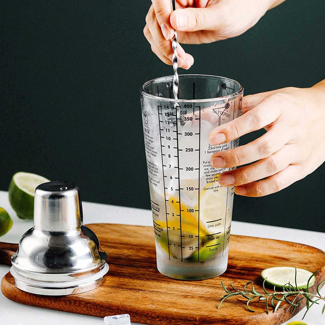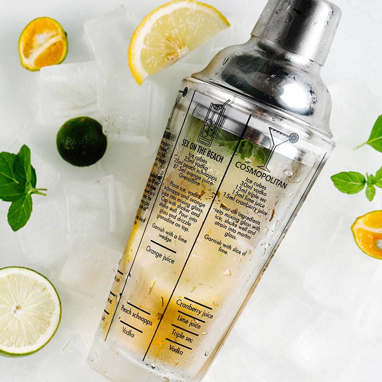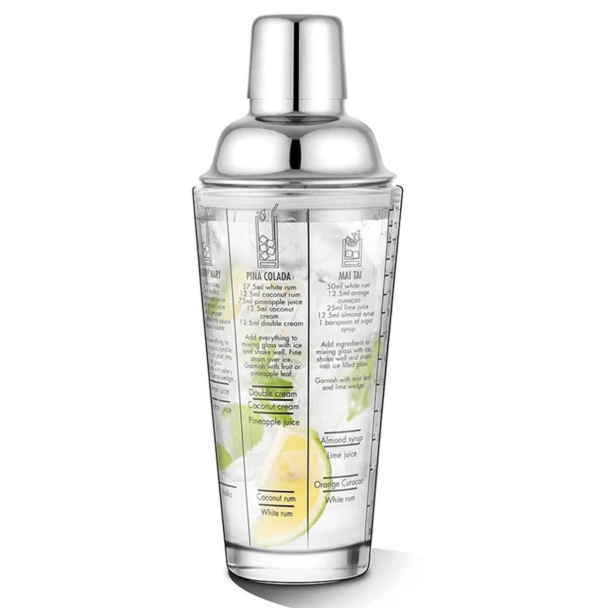 Cocktailshaker i glas och rostfritt stål som gör det enkelt att blanda klassiska drinkar med rätt proportioner. Recept och mått är tryckta på utsidan, så ingredienser kan mätas direkt i shakern utan extra måttkopp. Glasbehållaren ger bra överblick över nivån under blandning, medan locket i rostfritt stål sitter stabilt vid skakning. Volymen på 400 ml passar för snabb drinkmixning hemma. Shakern tål maskindisk för smidig rengöring efter användning.