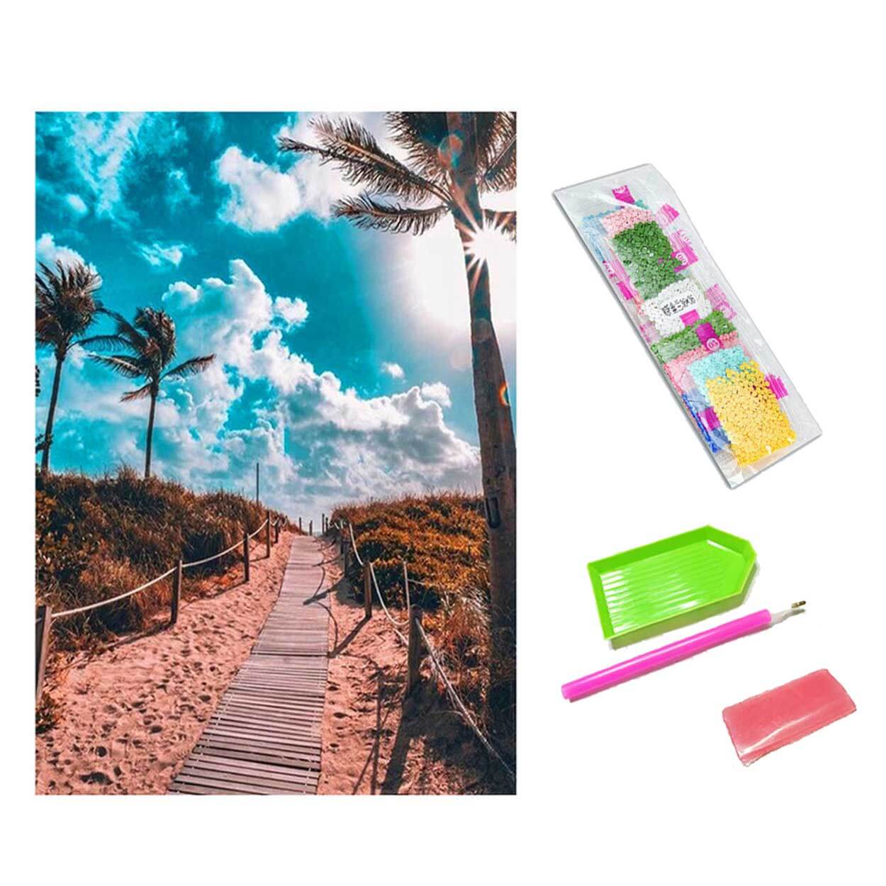 Diamond painting-set med motivet Beach Walk för dig som vill skapa en diamantmålning steg för steg. Setet innehåller duk med numrerat mönster, fasettslipade plastdiamanter samt verktyg för applicering. Diamanterna hälls i tråget så de lägger sig rätt och plockas upp med pennan. Medföljande lim gör att diamanterna fäster stabilt på duken under arbetet. När motivet är klart kan det hängas upp eller ramas in. Storlek 30 x 40 cm.