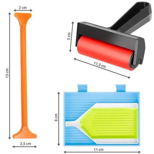 Verktygsset för diamond painting som förenklar både applicering och organisering av stenar. Fyra appliceringspennor gör det lätt att arbeta parallellt eller byta spets efter behov. Pressrullen hjälper till att trycka fast stenarna jämnt så att ytan blir slät och stabil. Med diamantorganisatör och etiketter sorteras färger och koder tydligt, vilket minskar spill och letande. Setet innehåller även pincett och tre tråg för snabb upphällning och noggrann placering. Allt kan förvaras samlat i den medföljande verktygsväskan.