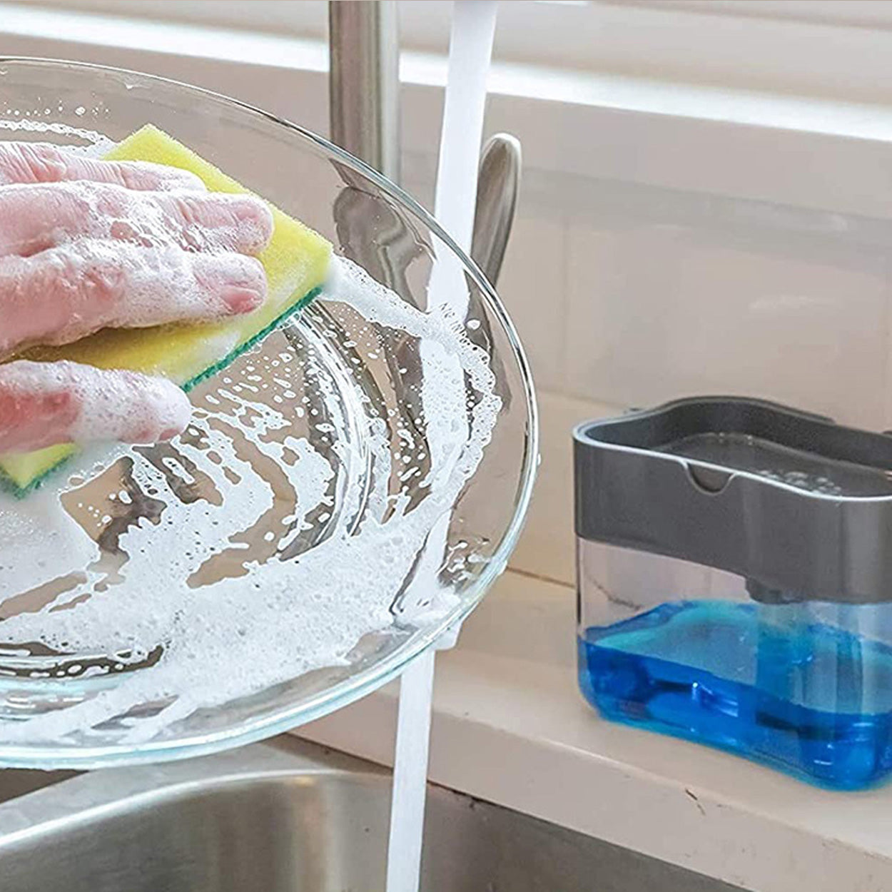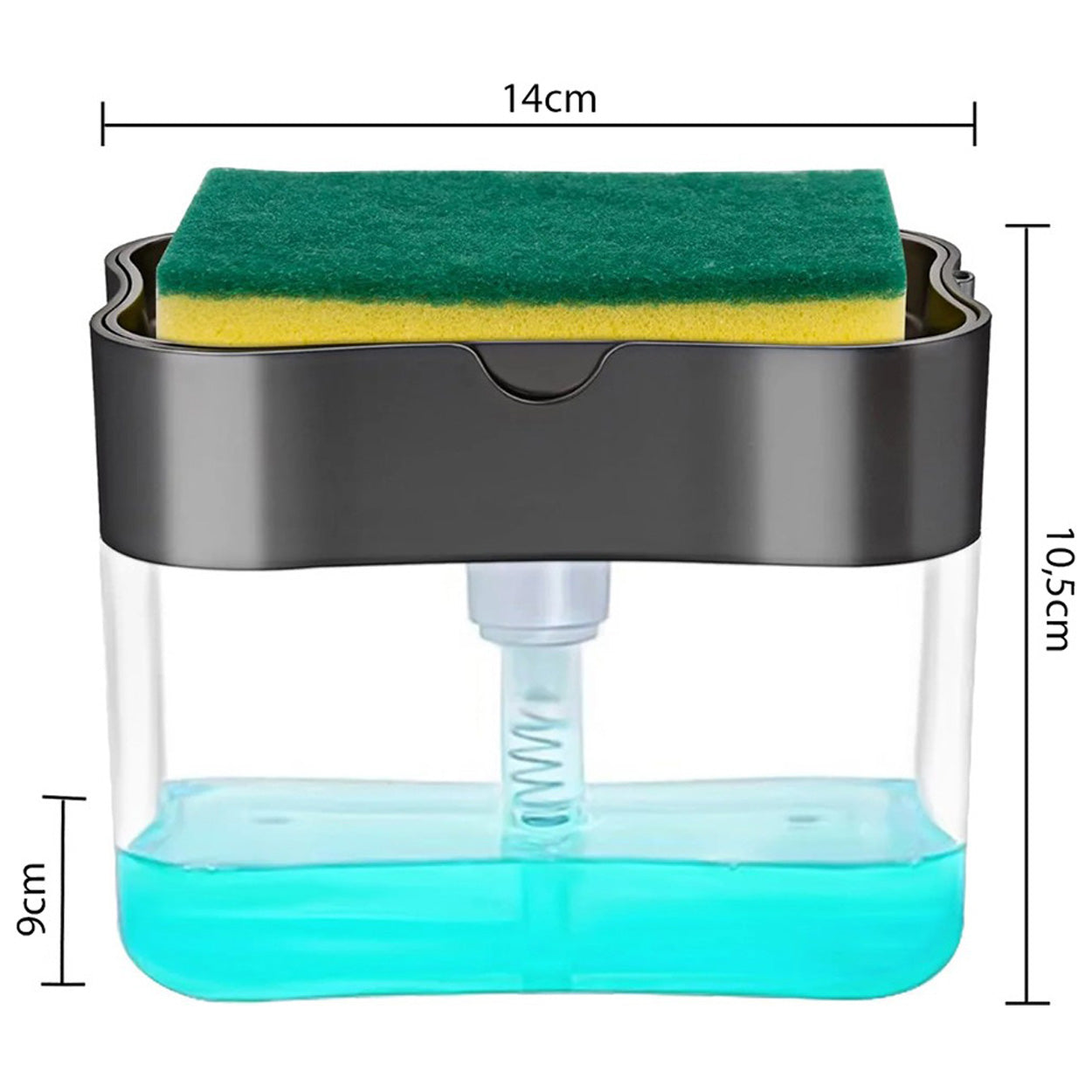 Diskmedelsdispenser med integrerad svamphållare som förenklar vardagsdisken och håller diskbänken mer organiserad. Behållaren fylls med diskmedel och doseras genom att trycka svampen mot pumpen, vilket ger en jämn mängd utan att behöva lyfta eller hälla. Lösningen minskar spill och kladd runt diskhon och gör det enklare att arbeta hygieniskt vid diskning. Passar lika bra i kök hemma som i fritidsboende där man vill ha en smidig och lättanvänd diskstation.