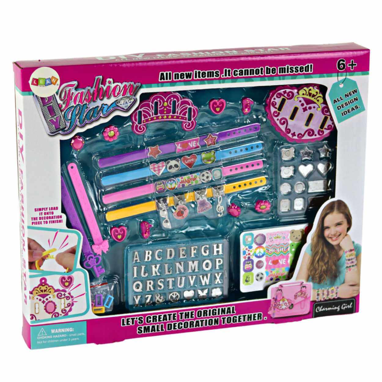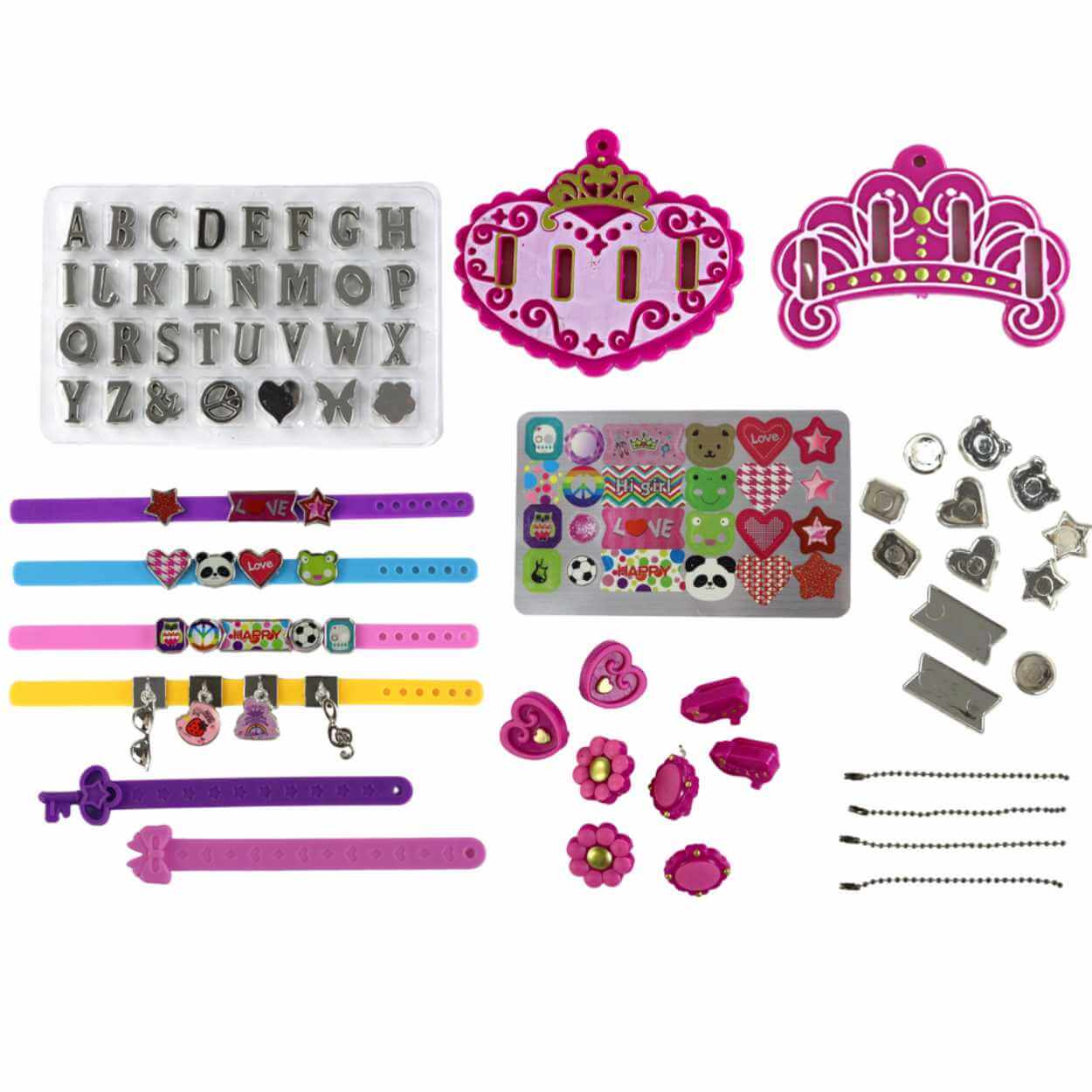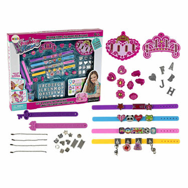 DIY smyckesset för att skapa personliga bokstavsarmband och hängsmycken. Setet innehåller bokstäver från A till Ö, armbandsremmar med snäppstängning, kedjor och ett urval av större hängsmycken. Med medföljande klistermärken med texter och mönster samt olika former att applicera dem på blir det enkelt att göra egna motiv och kombinationer. Passar som pysselaktivitet där barn kan designa smycken efter namn, initialer eller egna ord, samtidigt som finmotorik och kreativt tänkande tränas.