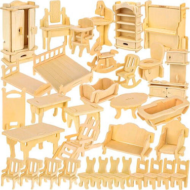 DIY möbelset i trä för dockhus som låter barn bygga och inreda egna rum. Delarna stansas ut från plywoodark och monteras enligt medföljande instruktioner. Sandpapper ingår för att slipa kanter och få en jämnare finish innan möblerna används eller målas. Setet innehåller 34 olika möbler och tillbehör som passar för flera typer av dockhusmiljöer, exempelvis säng, bord, stolar, garderob och piano. Ett praktiskt val för pyssel, kreativ inredning och lek där barnet själv bestämmer uttrycket.
