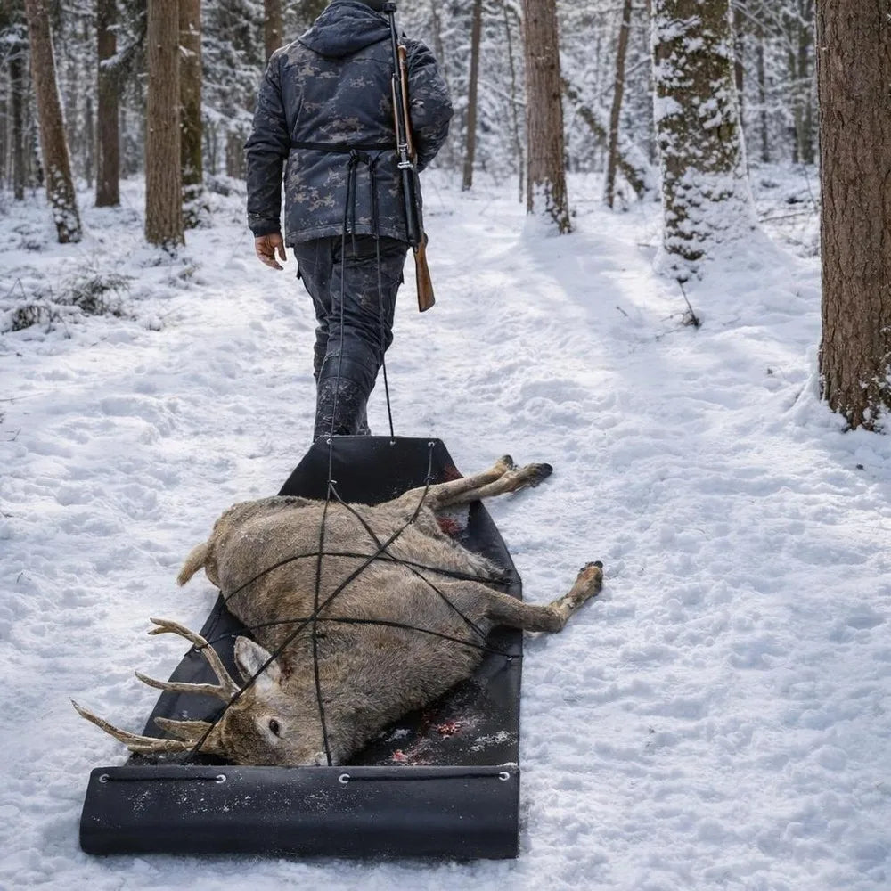 Dragmatta för vilttransport som gör det enklare att dra ut fällt vilt eller tung utrustning över snö, is, grus och lättare sly. Den släta, vattentäta ytan minskar friktionen och är lätt att spola av efter användning. Konstruktionen i slittålig HDPE är anpassad för fältbruk och har flera förstärkta metallöljetter som ger flexibla fästpunkter för dragrep och lastsäkring. Mattan kan rullas ihop för smidig transport och tar liten plats i bil eller packning. Dragrep medföljer.