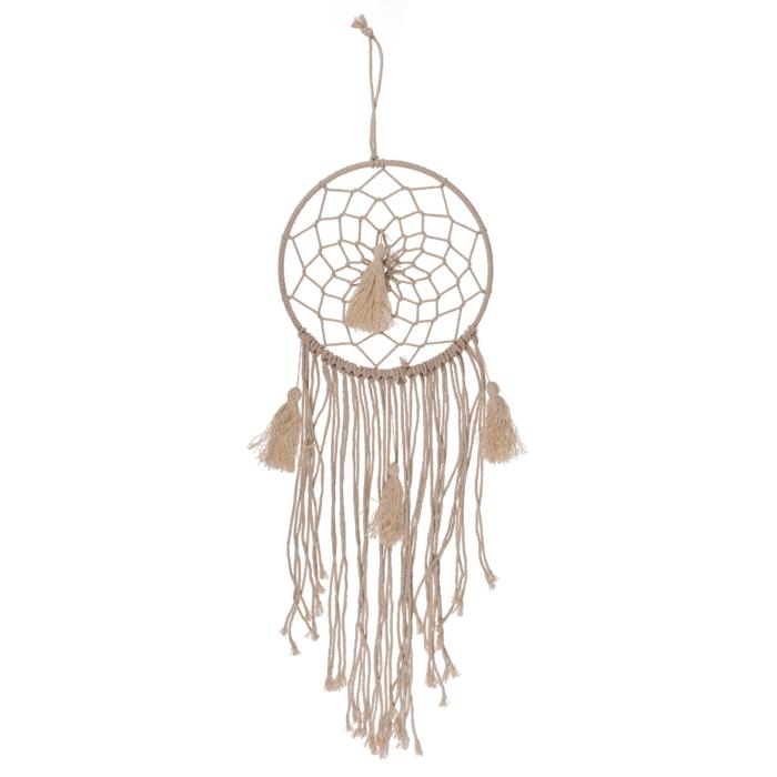 Drömfångare i tyg för upphängning på vägg eller i tak. Formen är inspirerad av den klassiska dreamcatcher-traditionen och fungerar som en dekorativ detalj i sovrum eller barnrum. Öglan i tyg gör den enkel att hänga upp på en krok, spik eller liknande fäste. Storleken ger tydlig närvaro utan att ta mycket plats och passar bra ovanför säng, vid fönster eller på en fri väggyta.
