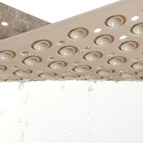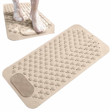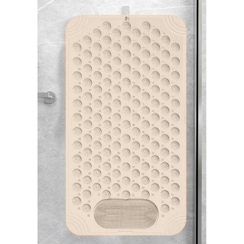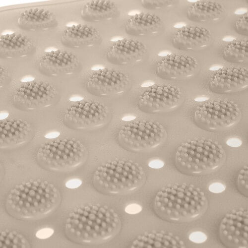 Halkfri duschmatta som ger säkrare fotfäste i dusch och badkar. Undersidan har sugkoppar som håller mattan stadigt på plats på släta ytor. Ovansidan har upphöjda massagenabbar som fungerar som fotskrubb och gör det enklare att rengöra fötterna utan att böja sig. Dräneringshål leder bort vatten för snabbare torkning och minskad fuktansamling. Efter användning kan mattan hängas upp i upphängningshålet och rengörs enkelt genom att sköljas av eller torkas av.