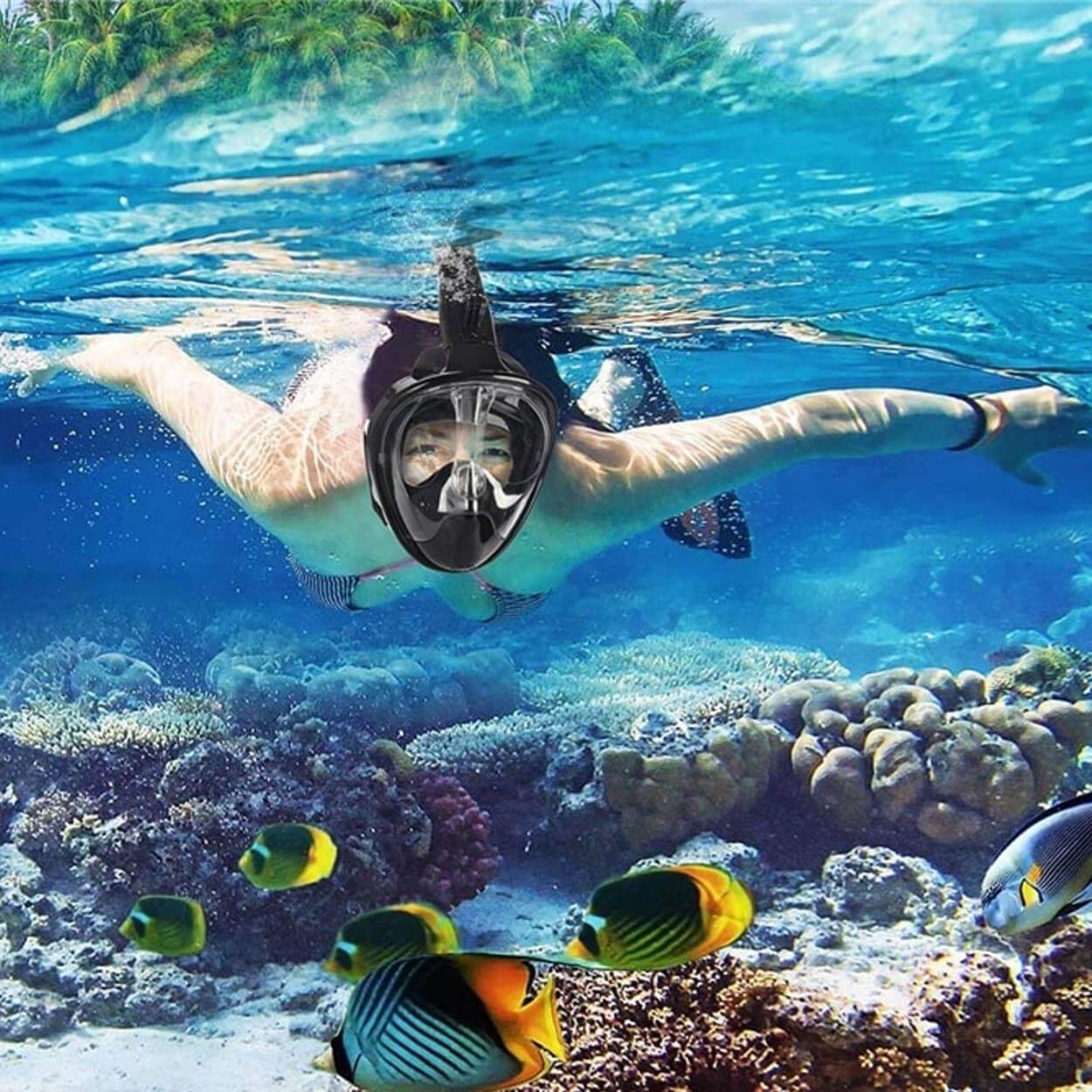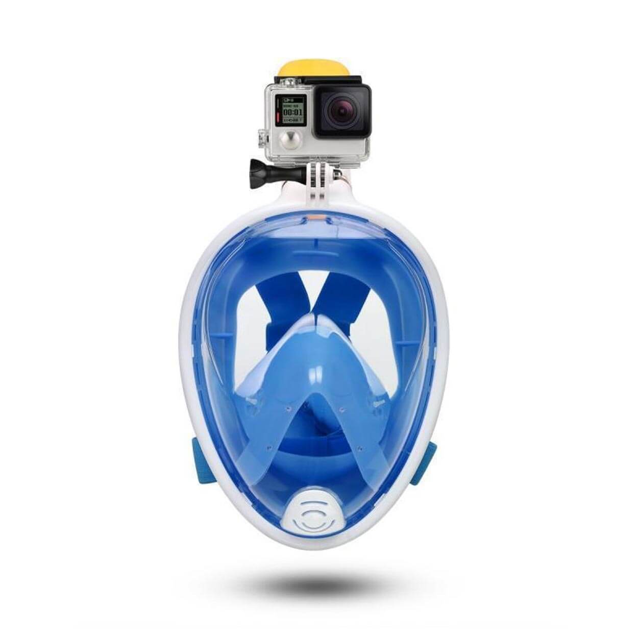 Dykmask med stort 360° synfält och universalt kamerafäste för actionkamera, exempelvis GoPro. Kamerafästet gör det enkelt att filma och fotografera under vattnet utan att hålla i kameran. Inbyggd snorkel ger smidig andning vid ytsim och snorkling. Passform väljs efter ansiktsmått mellan haka och ögon med stängd mun. Kamera och eventuellt undervattenshus ingår inte och köps separat.