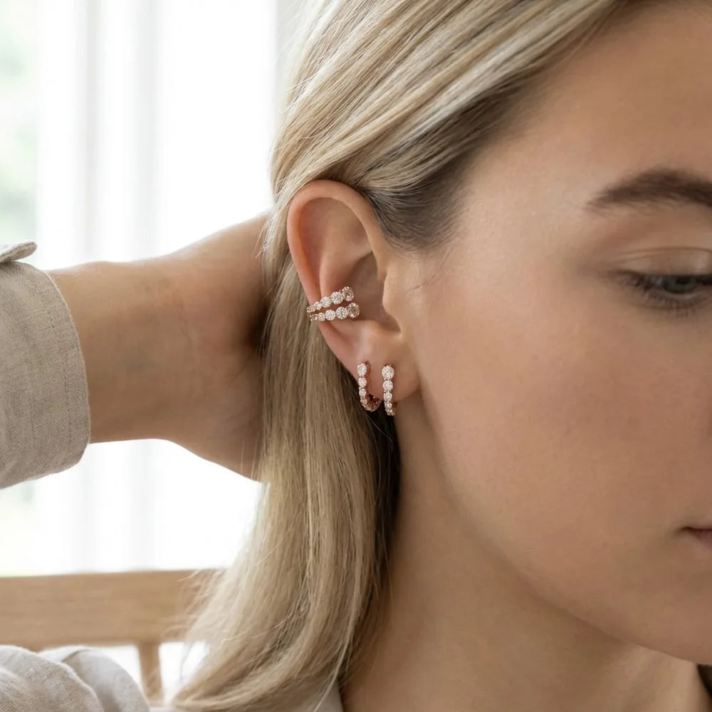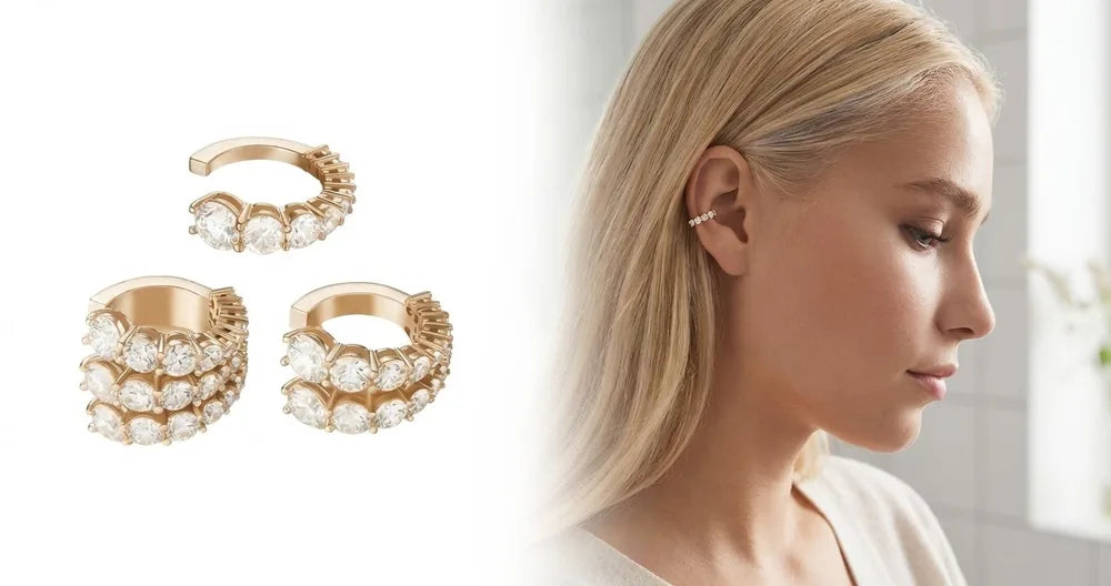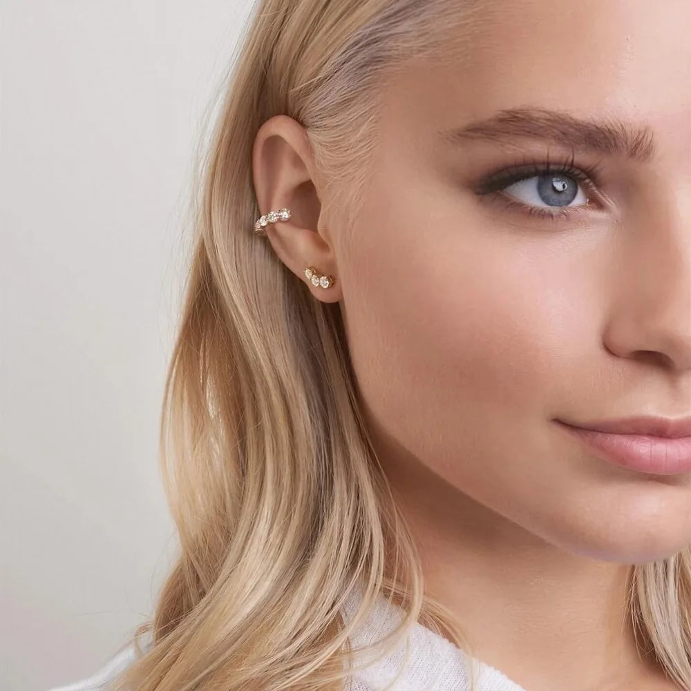 Ear cuff är ett öronsmycke som enkelt kläms fast på örat utan att du behöver ha hål. Den U-formade klämman gör att smycket sitter säkert och bekvämt under hela dagen. Dekorerad med strass eller CZ-diamanter får du ett elegant uttryck som passar både till vardag och fest.