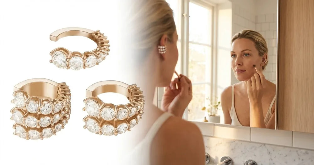 Placera ear cuffen genom att försiktigt föra den över ytterörat och tryck till så att den sitter bekvämt. Undvik att böja klämman upprepade gånger för att bevara passformen och metallen. Rengör ytan varsamt med en mjuk trasa för att behålla glansen på strass och plätering.