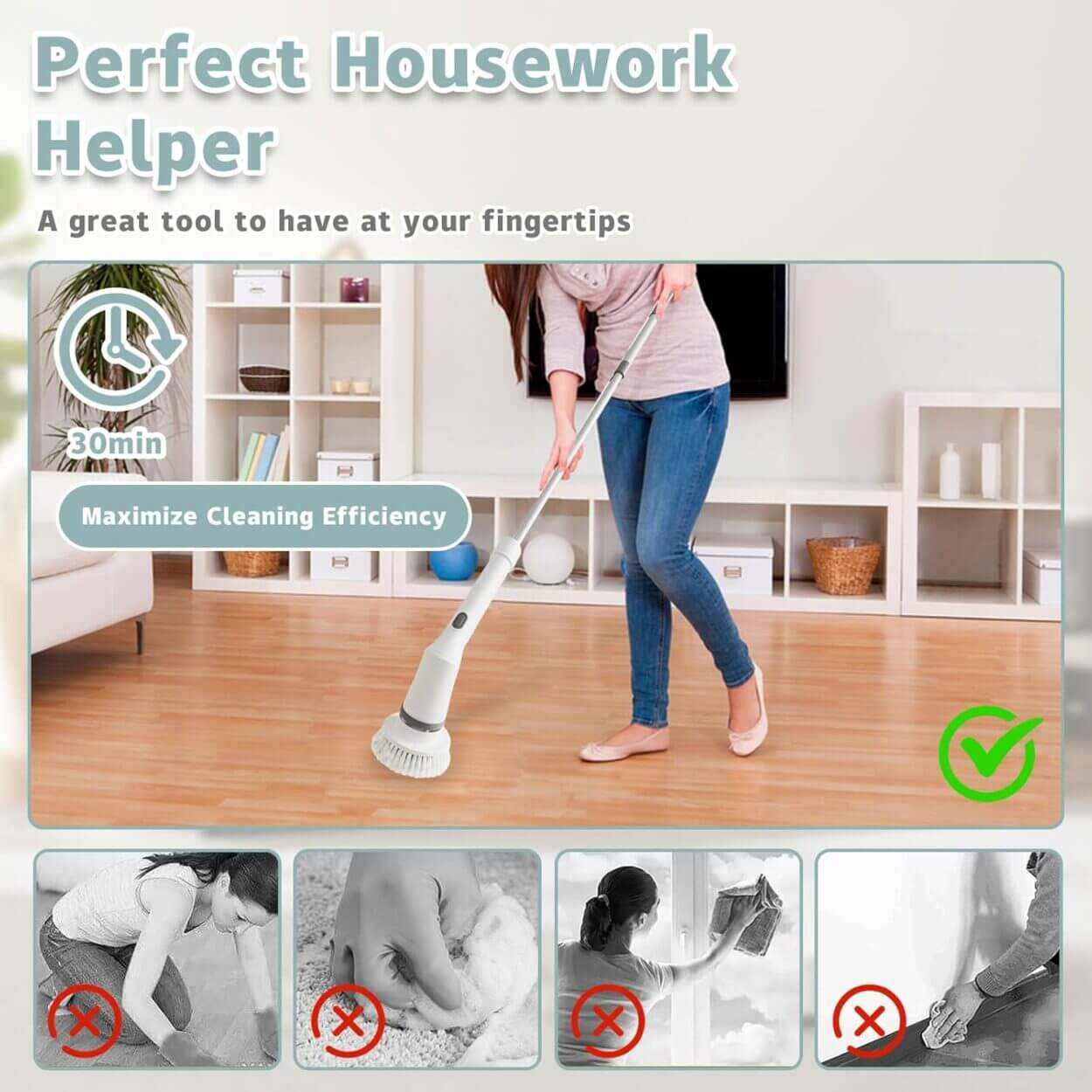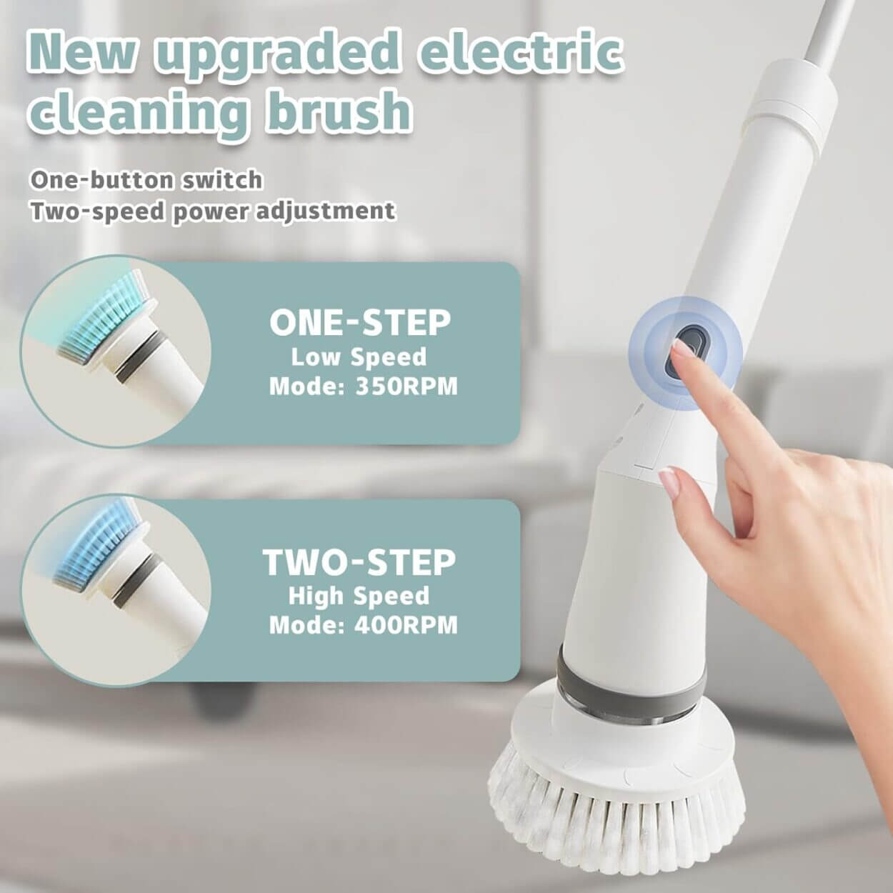 Elektrisk rengöringsborste med teleskophandtag som förenklar skrubbning av badrum, kök och andra svåråtkomliga ytor. Längden kan justeras mellan 35 och 110 cm för bättre räckvidd och mindre belastning på rygg och knän. Två hastigheter på 350 eller 400 varv/min ger kontroll beroende på smuts och underlag. Borsten har IPX7-klassad tätning och kan sköljas under kran efter användning. Uppladdningsbart 2000 mAh-batteri ger cirka 100 min drift och laddas via USB-C på runt 3 timmar. Levereras med 6 borsthuvuden och USB-C-kabel.