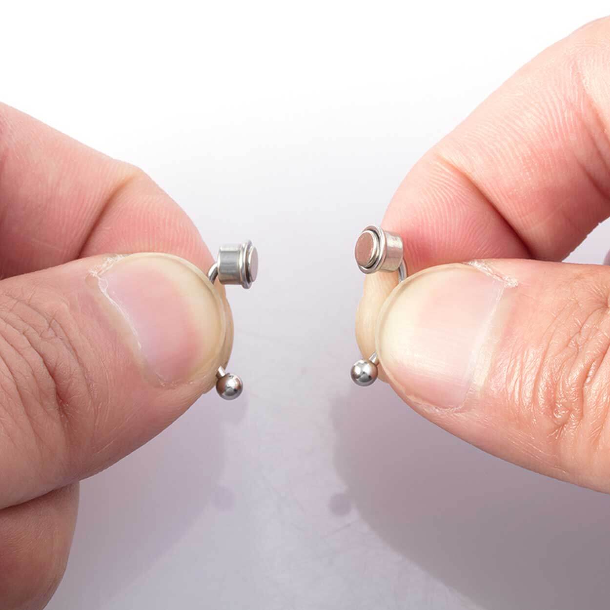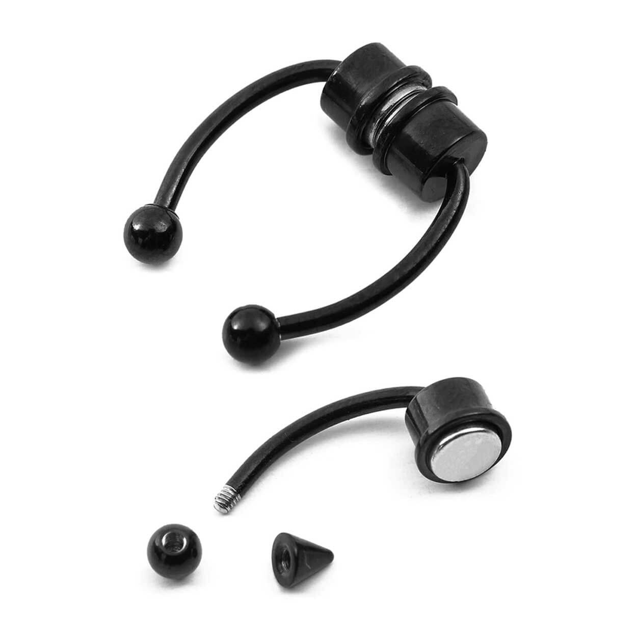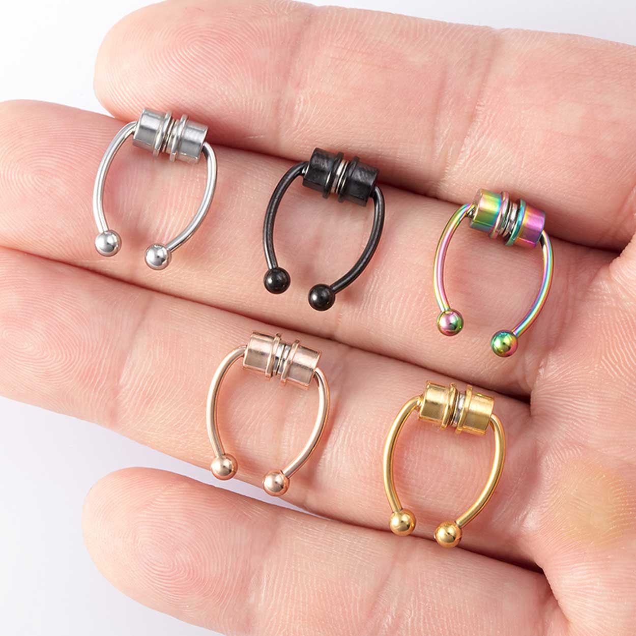 Magnetisk fake näsring som ger septumlook utan håltagning. Ringen fästs med magneter och kan tas av lika snabbt som den sätts på, vilket gör den smidig för tillfällig användning. Två par utbytbara skruvhuvuden ingår så att uttrycket kan varieras utan att byta hela ringen. Passar för dig som vill testa näspiercingstil eller växla look mellan olika tillfällen utan permanent piercing.