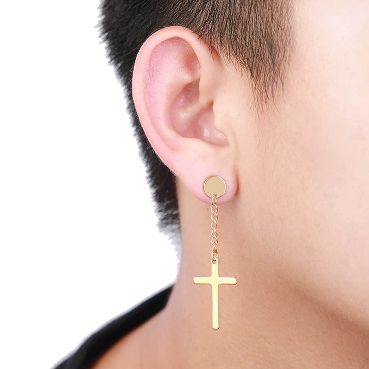 Fake plug-örhängen med hängande kors som ger en piercinglook utan att du behöver töja örat. Konstruktionen sitter som ett vanligt örhänge men efterliknar en plug i 8 mm. Korset hänger fritt och ger en tydlig siluett som syns även på avstånd. Tillverkade i kirurgiskt stål 316L för en slitstark och tålig känsla vid regelbunden användning. Levereras som ett par och passar för dig som vill kombinera plug-stil med ett rörligt hänge.