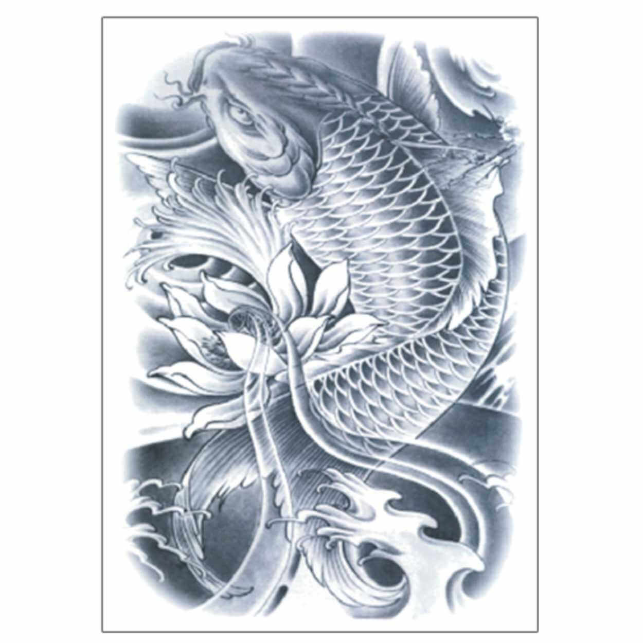 Fejktatuering för ryggen med koifiskmotiv som ger ett tydligt, temporärt uttryck utan permanent åtagande. Placera motivsidan mot huden och fukta ordentligt med svamp eller handduk. Vänta minst 30 sekunder och dra sedan försiktigt bort pappret. Resultatet blir bäst på ren och torr hud. När tatueringen ska tas bort används babyolja eller hudvänlig alkohol. Applicera, vänta cirka 10 sekunder och gnid varsamt tills motivet släpper helt.