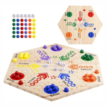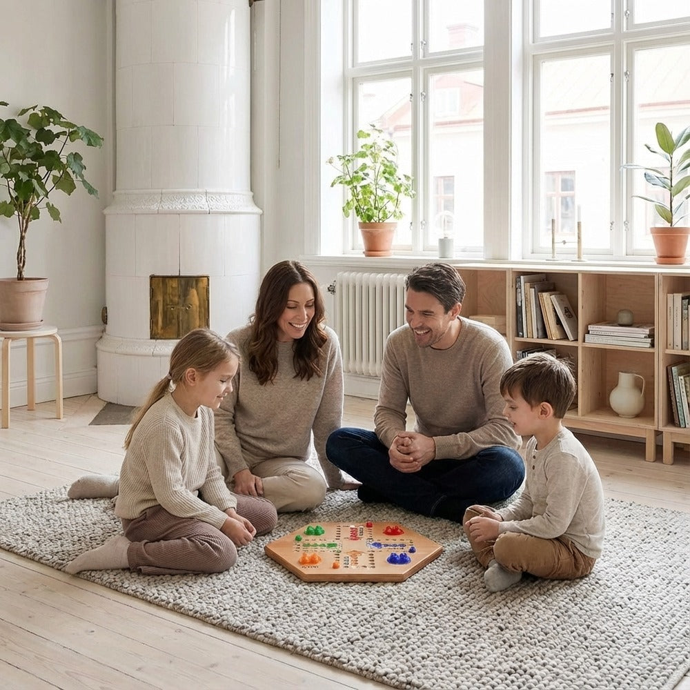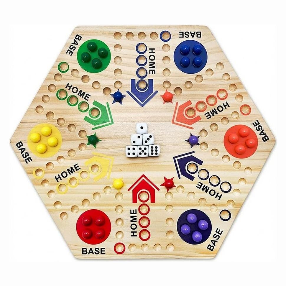 Fia med knuff-inspirerat brädspel i trä för spelkvällar hemma och i grupp. Spelplanen har borrade hål som håller pjäserna stadigt och gör det lättare att följa spelet även om bordet rör sig. Varje färg har tydligt markerade BASE- och HOME-zoner som guidar rundan från start till mål. Setet levereras med spelpjäser och tärningar så att spelet kan startas direkt. Passar 2–6 spelare och bygger på enkla regler med tärningskast och lätt taktik.