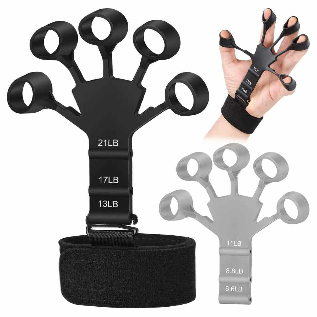 Fingertränare för grepp- och fingerstyrka som gör det enkelt att träna händerna när som helst. Två tränare ger totalt sex motståndsnivåer från 6,6 till 21 lb, så träningen kan anpassas från lätt aktivering till tyngre styrkearbete. Silikonmaterialet ger ett slitstarkt och behagligt grepp vid upprepad användning. Passar för musiker, klättrare och idrottare, men även för vardaglig handträning och rörlighet. Underarmsankare ingår för mer stabilt motstånd och fler övningsvarianter.