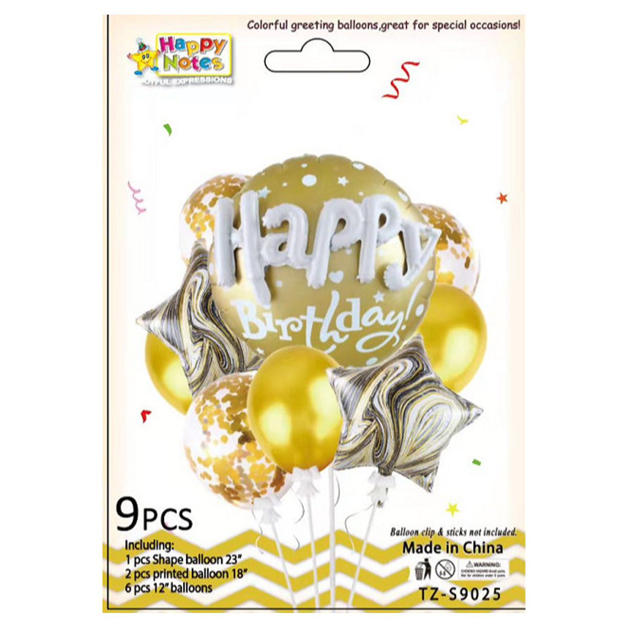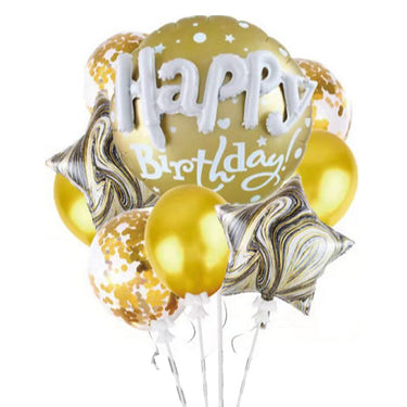 Ballongset för födelsedag som gör det enkelt att bygga en tydlig dekoration på kort tid. Setet innehåller en stor Happy Birthday-textballong (58 cm), två stjärnformade ballonger (46 x 42 cm) samt sex latexballonger i två typer: tre guld och tre konfetti (30 cm). Ballongerna kan fyllas med luft eller helium beroende på önskad effekt och placering. Ballongband ingår för smidig upphängning och arrangemang vid kalas och överraskningar.