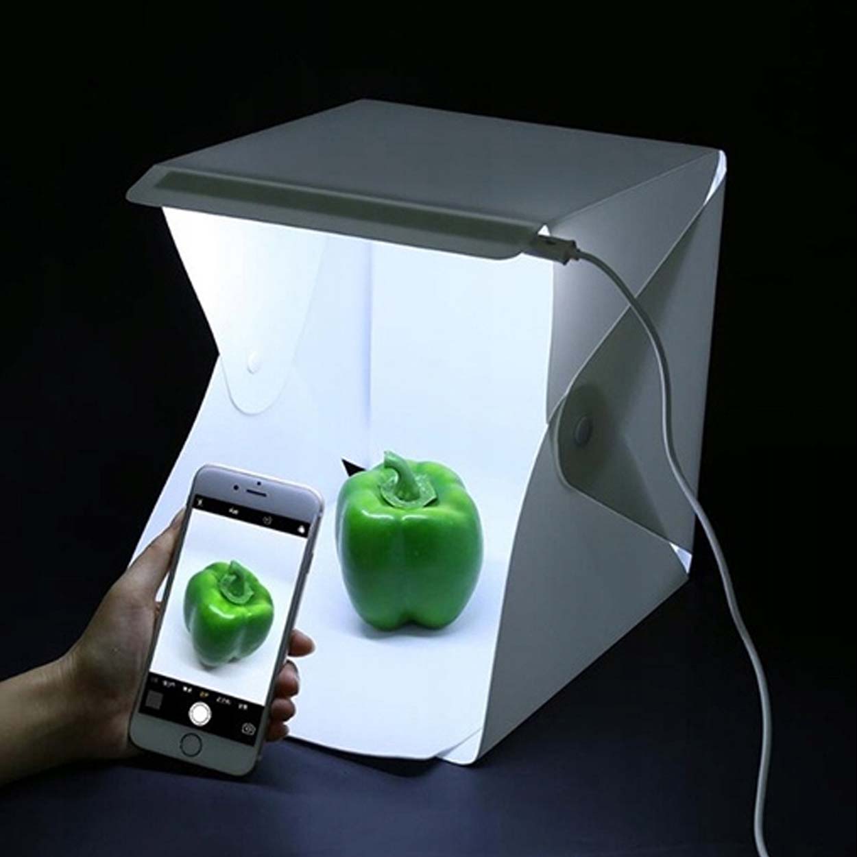 Fototält / ljustält – skugglös produktfoto – 20 LED, USB, vit svart bakgrund