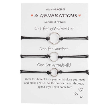 Generationsarmband i set med tre matchande armband för mormor, mamma och dotter. Armbanden är justerbara mellan 16 och 28 cm, vilket gör dem enkla att anpassa till olika handleder. Varje armband har en rund symbol i egen storlek, vilket ger en tydlig koppling mellan de tre. Passar som vänskapsarmband inom familjen eller som gåva där två kan ges bort och ett behållas själv. Låg vikt gör dem bekväma att bära under dagen.
