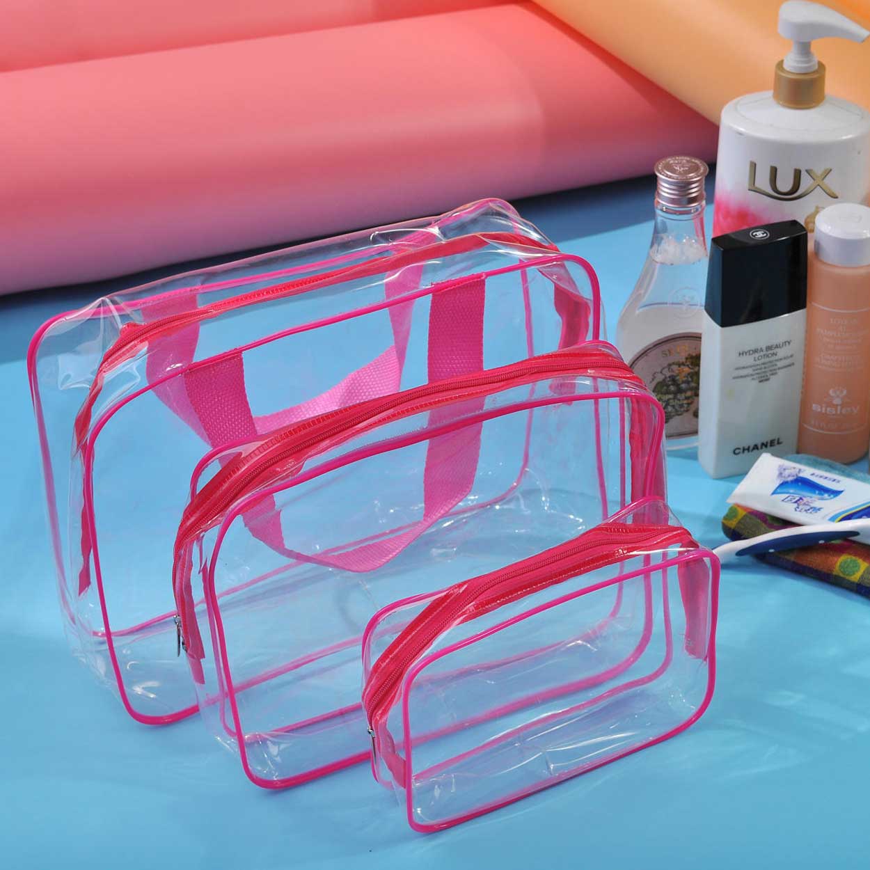 Genomskinlig sminkväska i set om tre necessärer som gör packning och ordning enklare. Den transparenta designen ger direkt överblick över innehållet så att smink, hudvård och hygienartiklar hittas snabbt utan att behöva leta. Tre olika storlekar gör det lätt att separera produkter efter användning eller storlek, vilket passar både i resväska och i badrumsskåp. Största väskan har handtag för smidig transport när du vill bära den separat.