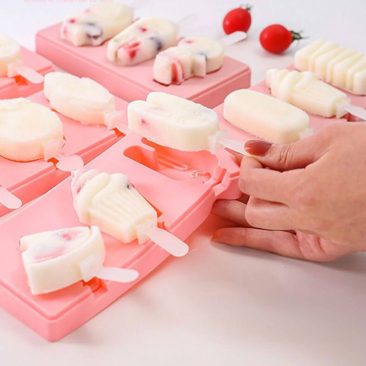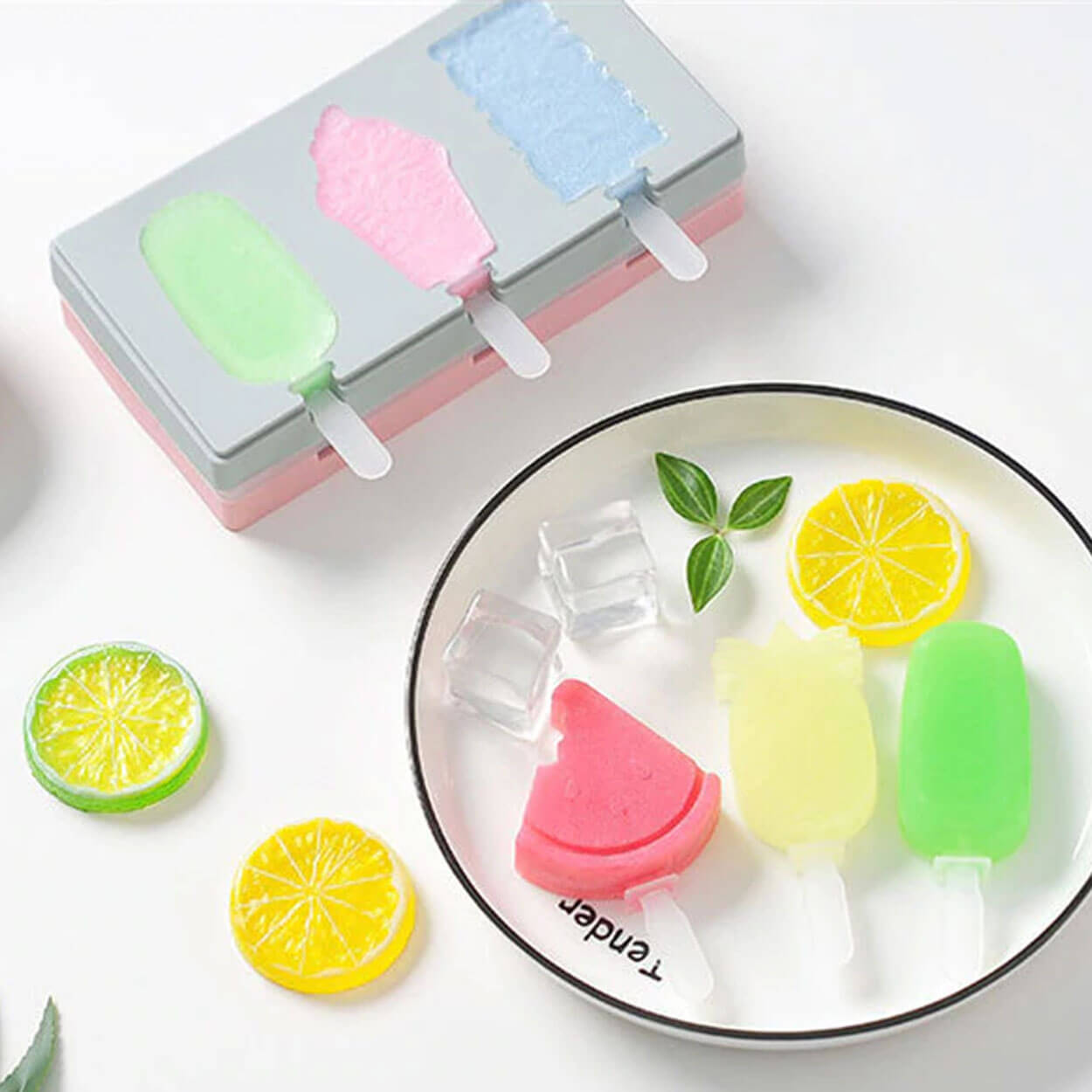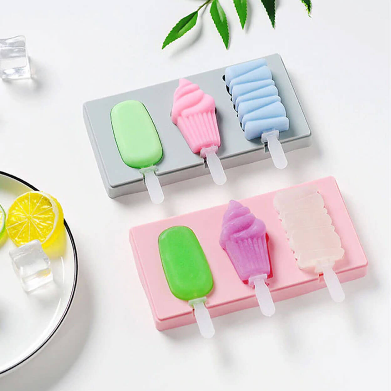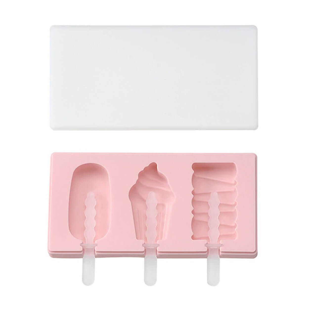 Glassform för att göra egna glasspinnar hemma. Formen har tre separata fack och fylls enkelt med exempelvis juice eller saft innan den ställs i frysen. BPA-fri silikon ger en flexibel form som gör det lättare att få ut glassen när den är klar. Lock och tre återanvändbara pinnar ingår, vilket förenklar både infrysning och servering. Vid behov lossar glassen smidigare om formen spolas kort i ljummet vatten. Konstruktionen kan staplas för att spara plats när flera formar används.