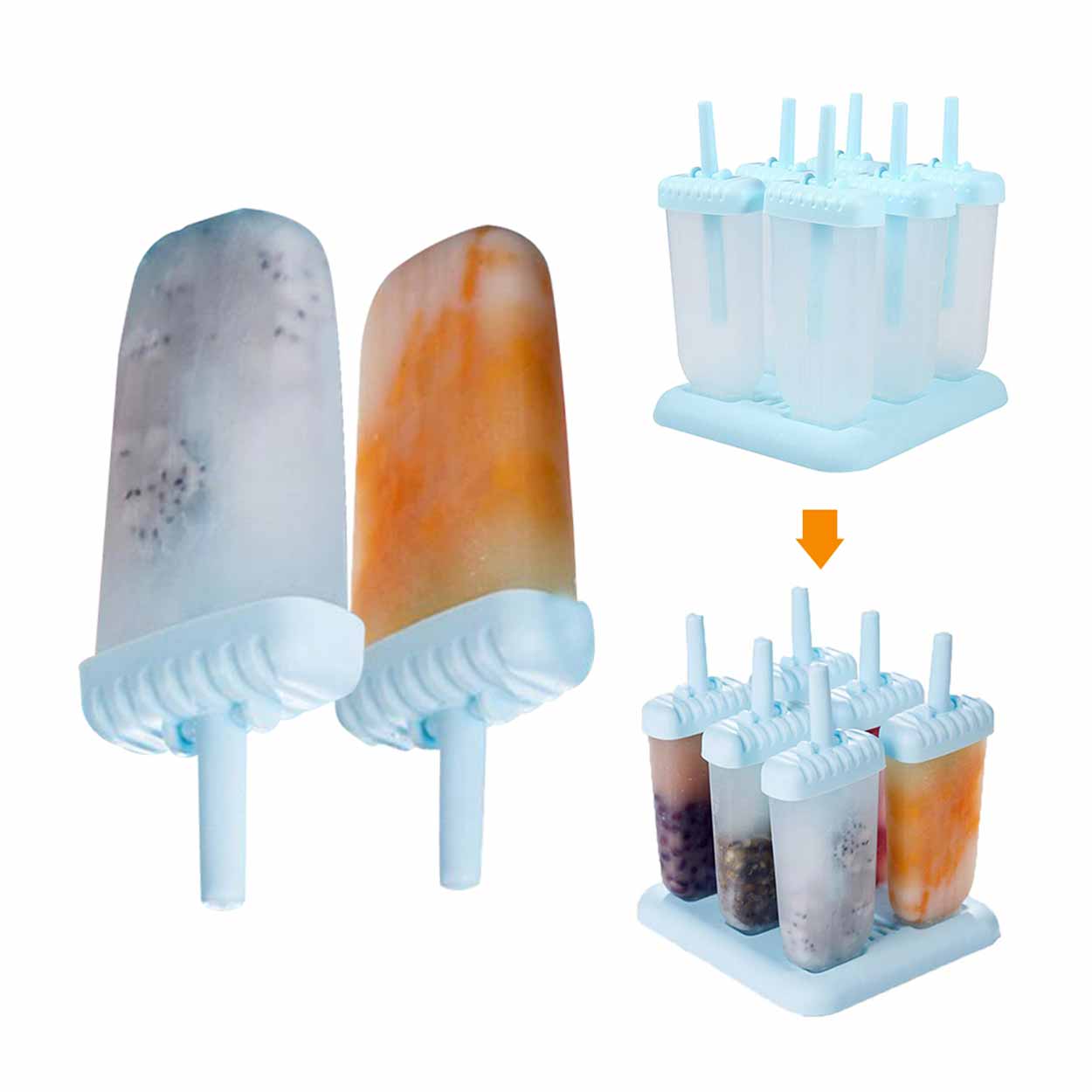 Glassform för att göra egna glasspinnar hemma. Formen ger 6 glassar per omgång och fylls enkelt med exempelvis juice eller saft för att skapa egna varianter. BPA-fri plast gör den lämplig för frysta desserter. Varje form har en tillhörande pinne så att glassen blir lätt att ta ut och servera. Formarna kan tas loss från stället för smidigare förvaring. För enklare urtagning kan formen spolas i ljummet vatten så släpper glassen lättare.