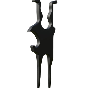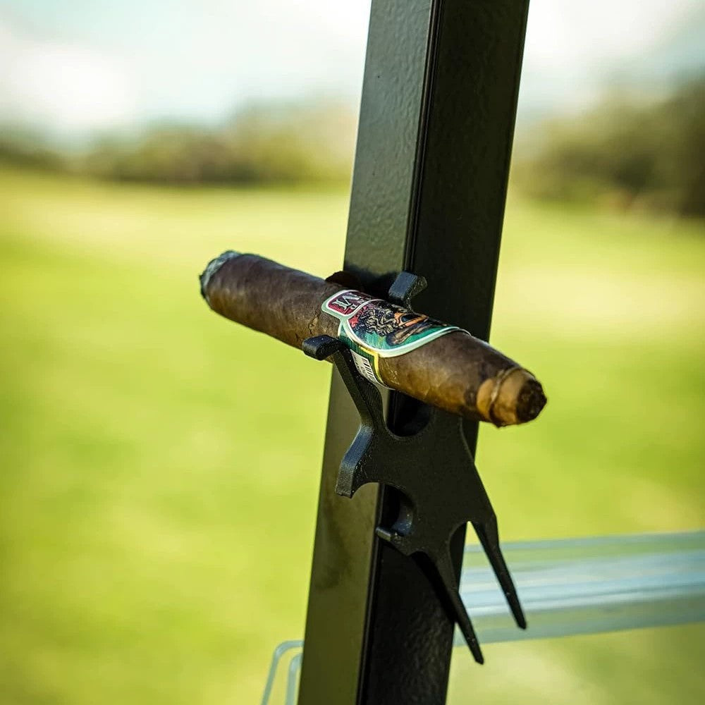 Golfverktyg som kombinerar cigarrhållare och kapsylöppnare i ett kompakt format. Den tvåspetsade konstruktionen trycks ner i gräset och håller cigarren upphöjd, vilket minskar risken att den blir fuktig eller smutsig under rundan. Kapsylöppnaren är integrerad i kroppen så att en dryck kan öppnas snabbt utan extra tillbehör i bagen. Metallkonstruktionen ger en tålig känsla och passar som praktisk accessoar på golfbanan eller som gåva till golfintresserade.