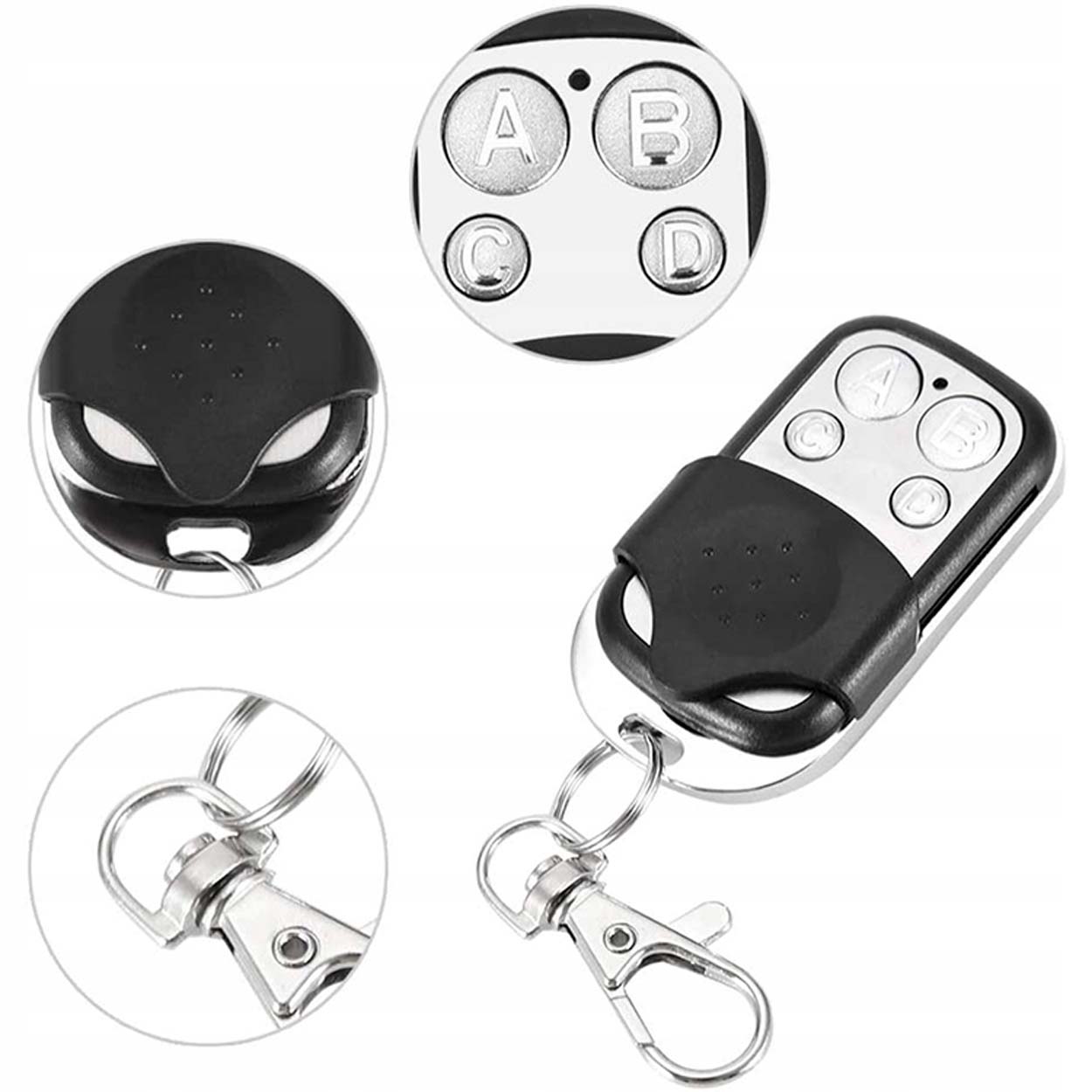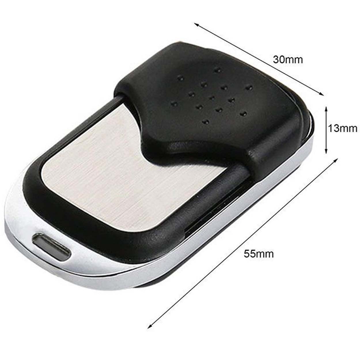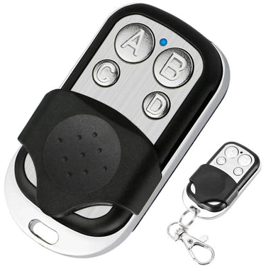 Universal fjärrkontroll för port, grind eller larm som kan kopiera fast kod på 433,92 MHz. Fyra programmerbara knappar gör det möjligt att styra upp till fyra kanaler från samma sändare. Knapparna skyddas av en lucka som minskar risken för oavsiktliga tryck i ficka eller väska. Fjärrkontrollen drivs av ett A27 12 V-batteri och har ett tåligt metallhölje för vardagsanvändning. Kontrollera att din befintliga fjärr använder fast kod och 433,92 MHz innan programmering.