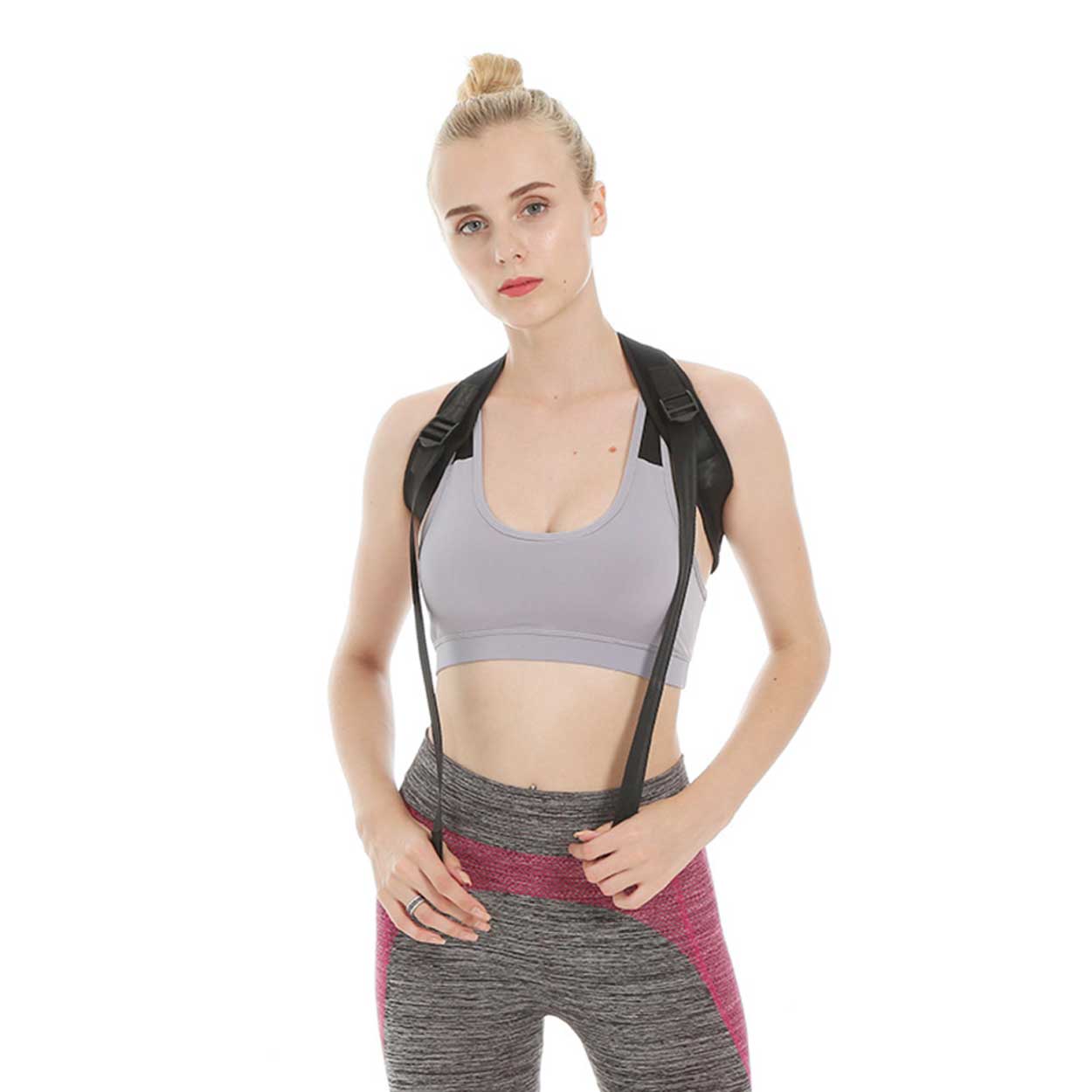 Börja med låg spänning och öka gradvis för att vänja kroppen vid stödet. För bästa komfort kan västen bäras över ett tunt linne eller T-shirt. Justera så att axlarna förs lätt bakåt utan att det känns begränsande vid andning eller rörelse.