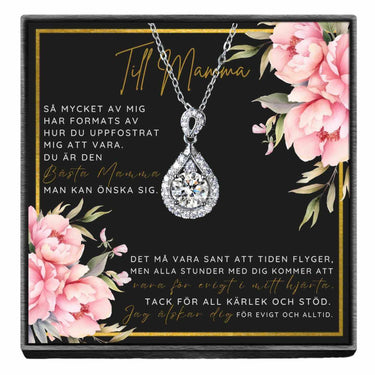 Gåvohalsband för mamma som levereras presentklart med hälsningskort och en elegant ask. Smycket är tillverkat i rostfritt stål och pryds av kubisk zirkonia som ger ett tydligt skimmer i ljuset. Längden är justerbar för att sitta bekvämt och passa olika halsmått. Halsbandet fungerar både till vardags och vid mer uppklädda tillfällen och är ett enkelt sätt att ge en personlig gåva utan extra inslagning. Kortet har en färdig, varm text som gör presenten komplett direkt.