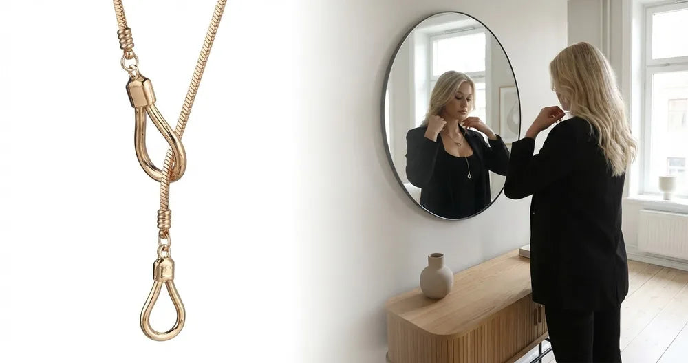 Dragskomekanismen gör att längden kan finjusteras steglöst, vilket underlättar när halsbandet ska bäras över olika material eller kombineras med flera kedjor. För att minska slitage, undvik att dra i hänget när längden justeras och förvara halsbandet plant eller upphängt för att behålla kedjans form.