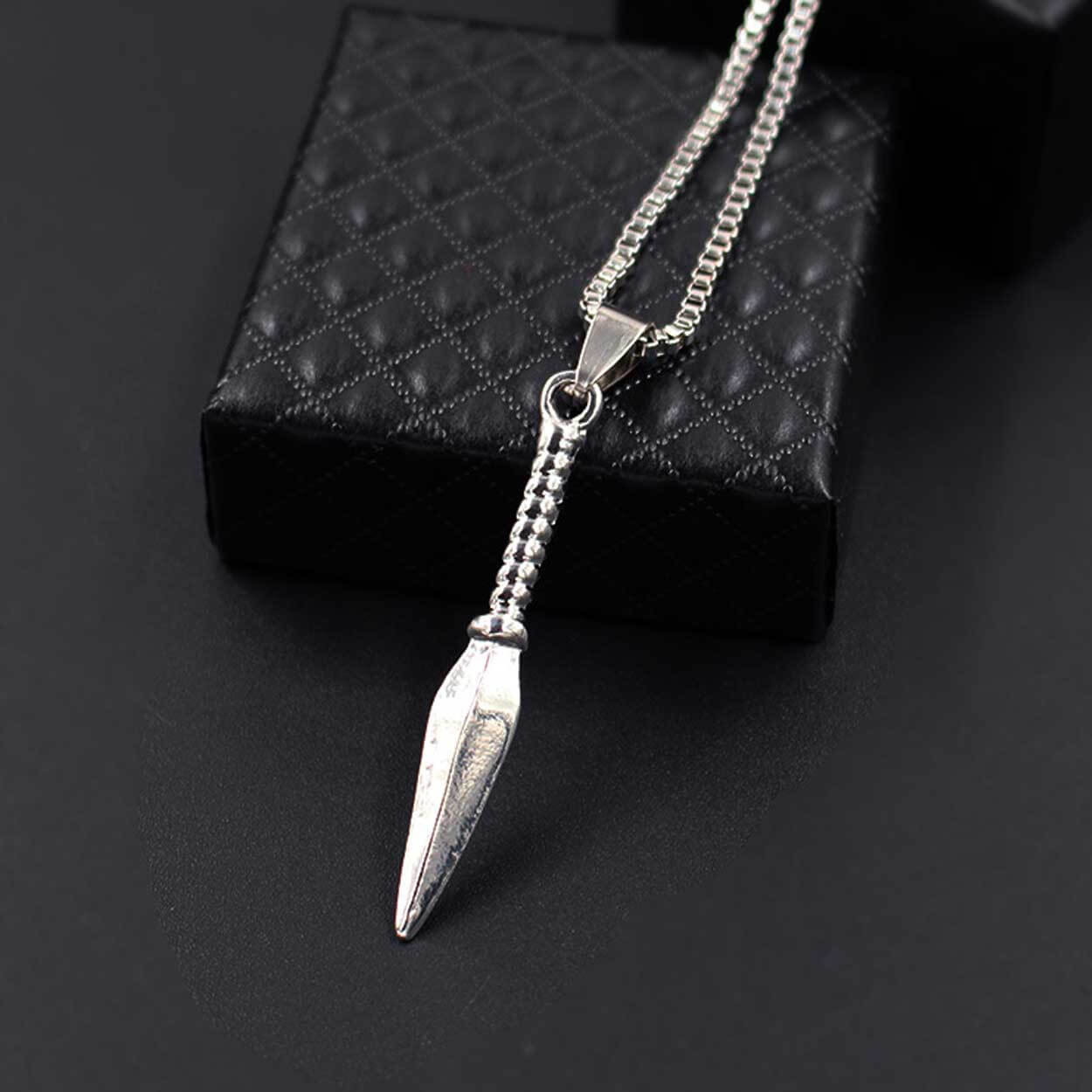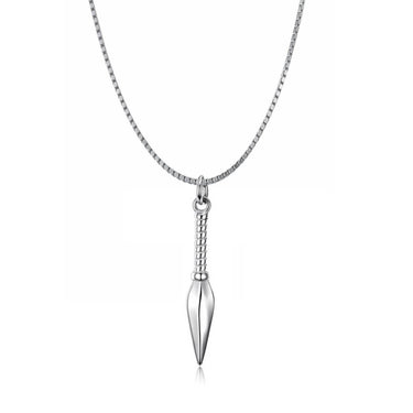 Spjuthalsband med boxkedja och hängsmycke i spjutform. Kedjan är cirka 60 cm lång, vilket ger en längre passform som fungerar både över tröja och till skjorta. Hänget är cirka 45 mm och ger en tydlig detalj utan att ta över helheten. Boxkedjan har en jämn struktur som gör att halsbandet ligger stabilt runt halsen och är enkelt att kombinera med andra smycken. Passar som vardagssmycke eller som en mer markerad detalj till enklare outfits.