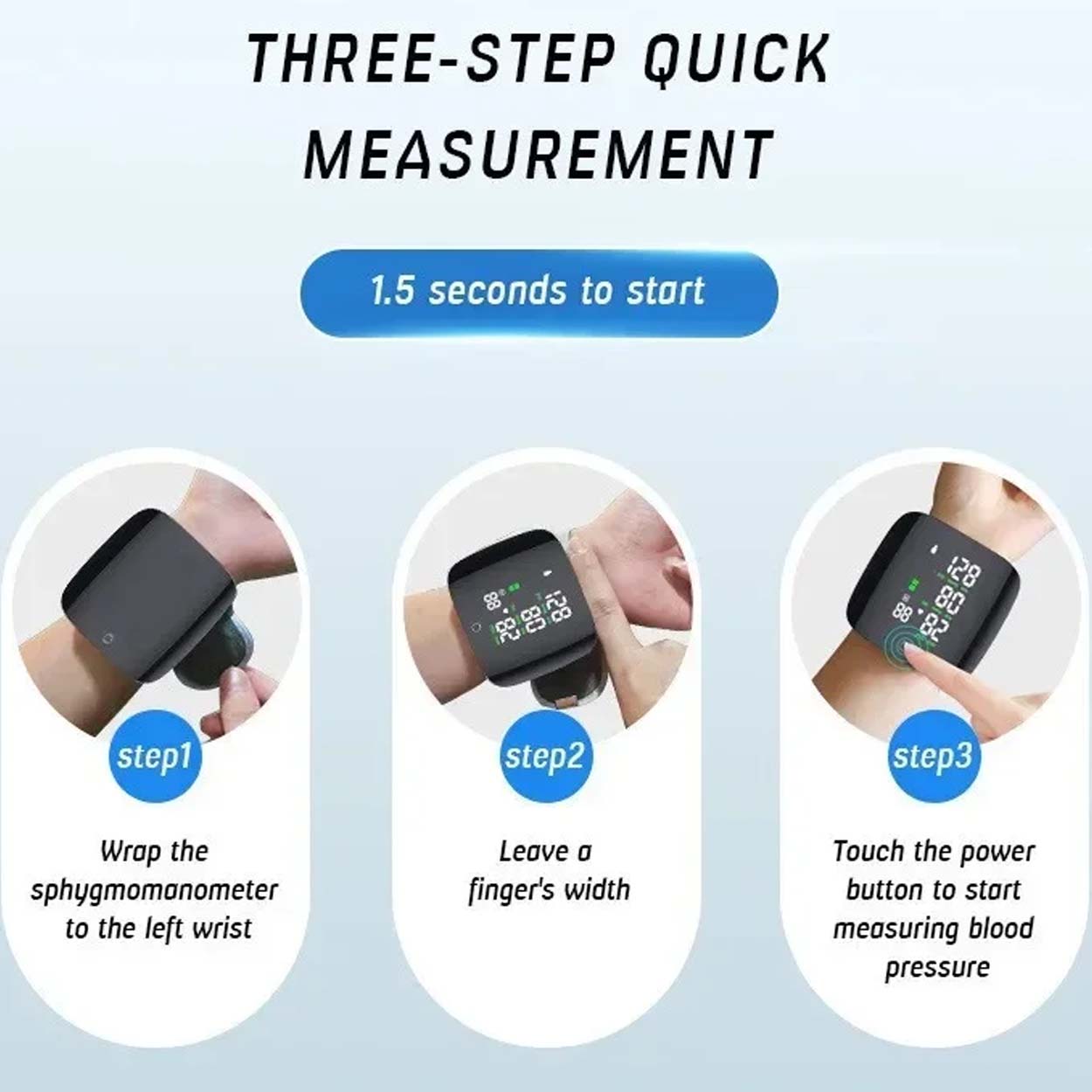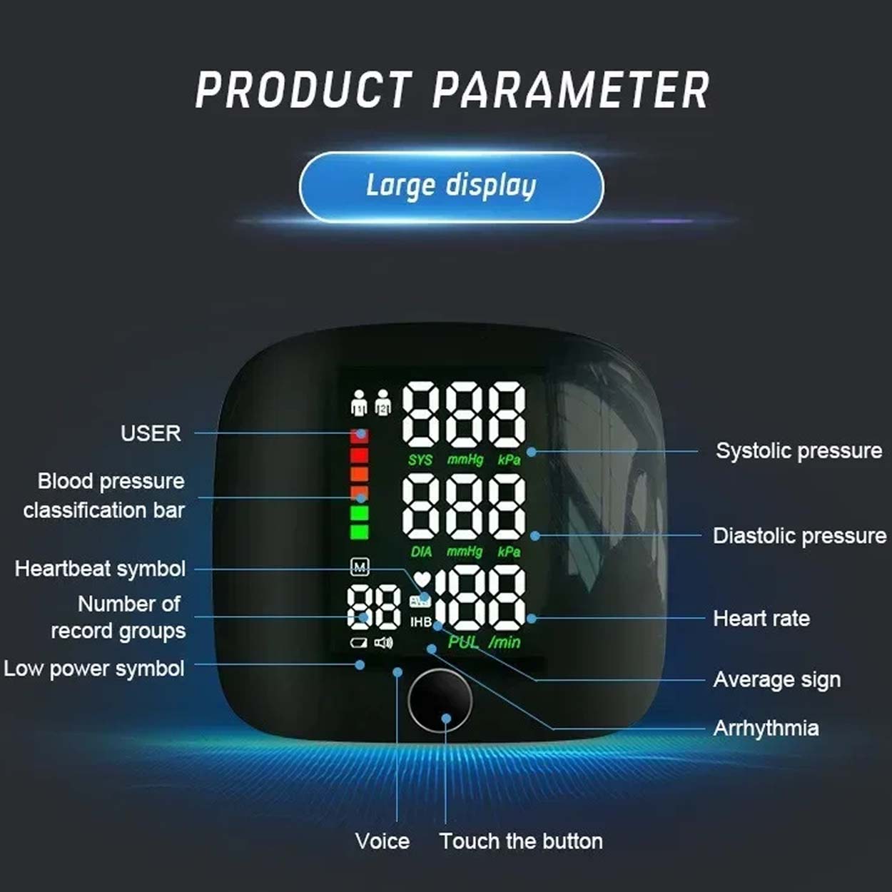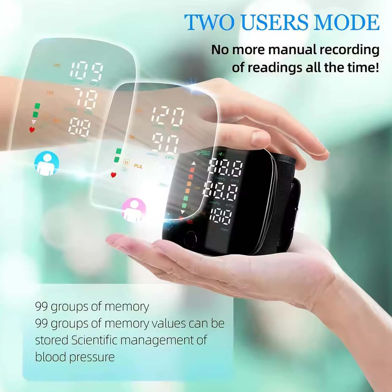 Handledsblodtrycksmätare / blodtrycksmätare – mätning hemma resor – röstuppläsning, LCD-display, 2 användare