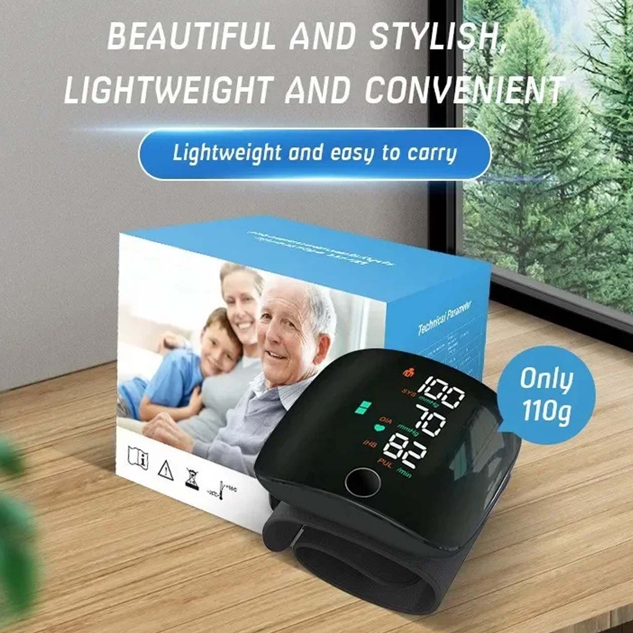 Handledsblodtrycksmätare som ger snabba avläsningar av systoliskt och diastoliskt tryck samt puls på en tydlig LCD-display. Oscillometrisk mätmetod och automatisk uppblåsning och tömning gör mätningen enkel utan extra tillbehör. Röstfunktionen läser upp resultatet på engelska och kan stängas av när tyst drift behövs. Minnesläge för två användare underlättar om flera i hushållet vill följa sina värden. Inbyggt uppladdningsbart litiumbatteri minskar behovet av engångsbatterier, och ett robust plastfodral skyddar vid förvaring och resa.
