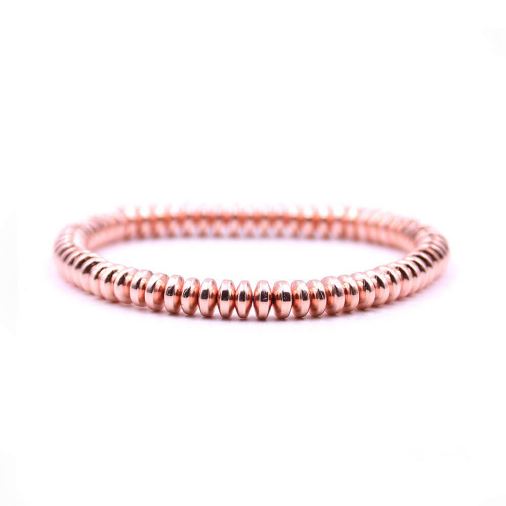 Handgjort armband med stenpärlor i hematit och roseguldpläterad finish. Den elastiska stretchpassformen gör armbandet enkelt att ta på och ger en följsam känsla runt handleden. Pärlorna har 6 mm diameter, vilket ger ett tydligt men balanserat uttryck som fungerar både till vardags och vid mer uppklädda tillfällen. Storleken är anpassad för handledsomkrets cirka 19–20 cm.