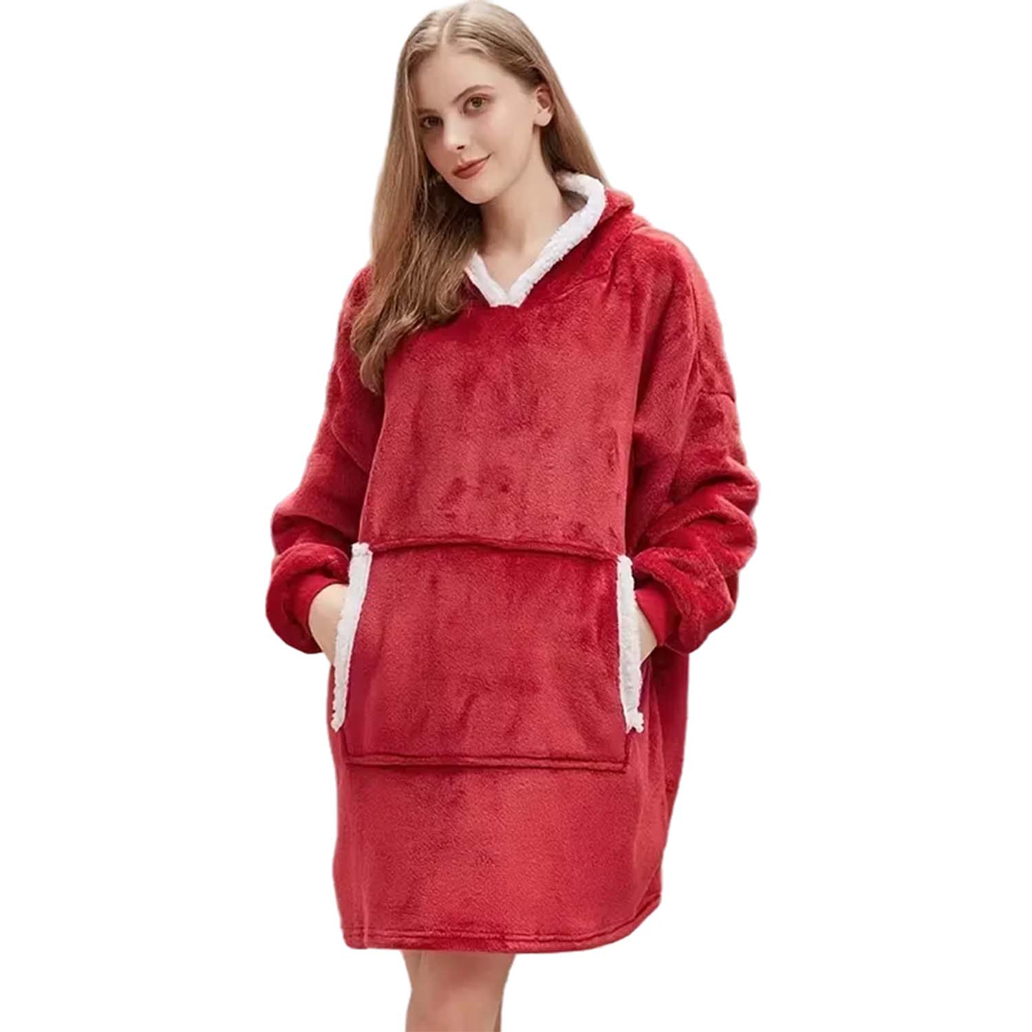 Hoodiefilt som kombinerar en varm filt och en hoodie i ett plagg. Oversize passform ger gott om rörelsefrihet vid soffhäng, arbete vid datorn eller när du vill hålla värmen hemma. Insidan är teddyfodrad för en mjuk och isolerande känsla, medan utsidan är i bomull. Stor huva ger extra skydd och kan även fungera som stöd när du lutar dig tillbaka. Rymlig magficka håller händerna varma och gör det enkelt att ha småsaker nära. Plagget kan maskintvättas för smidig skötsel.