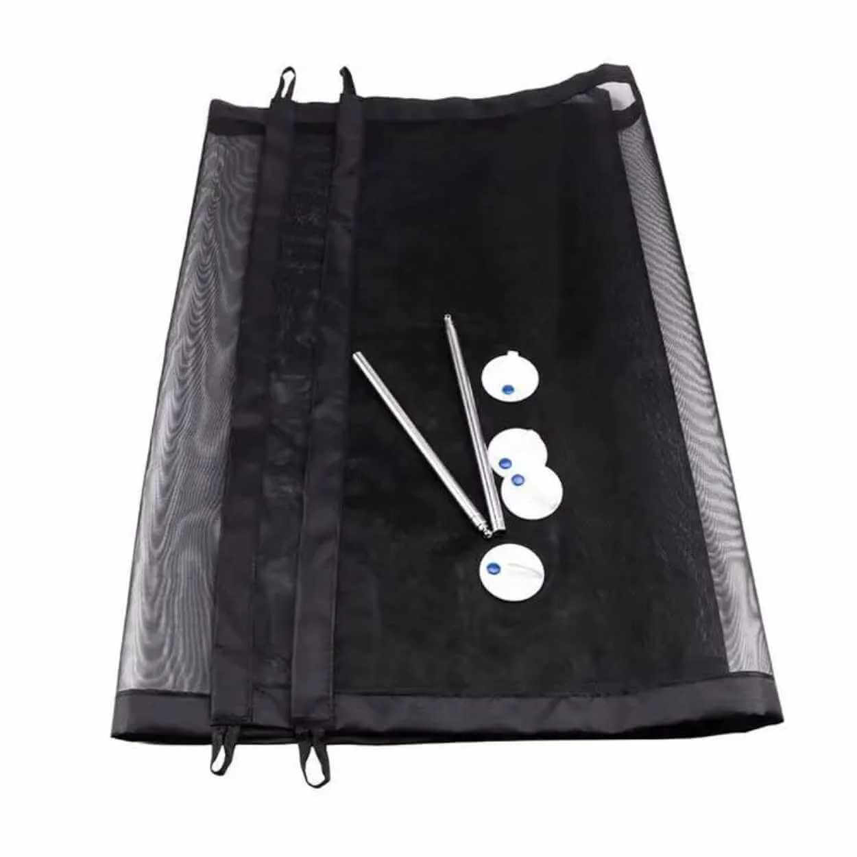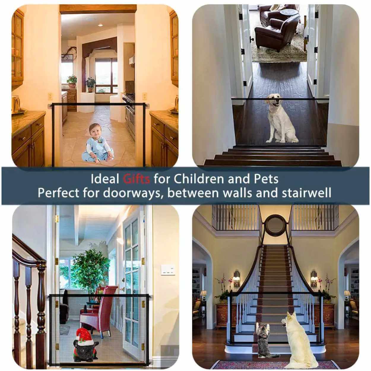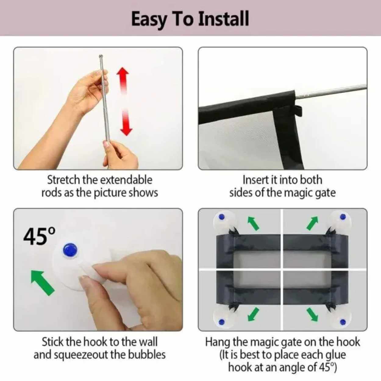 Självhäftande säkerhetsgrind som hjälper till att spärra av utvalda ytor i hemmet för små barn eller husdjur. Monteringen sker med självhäftande krokar, vilket gör att grindens fästen kan sättas upp utan borrning och utan permanenta ingrepp i väggar eller karmar. Konstruktionen är enkel att öppna och stänga när passagen behöver användas, samtidigt som den ger en tydlig avgränsning. Grindens format gör den användbar i flera typer av öppningar, och den kan demonteras och flyttas vid behov eller förvaras när den inte används.