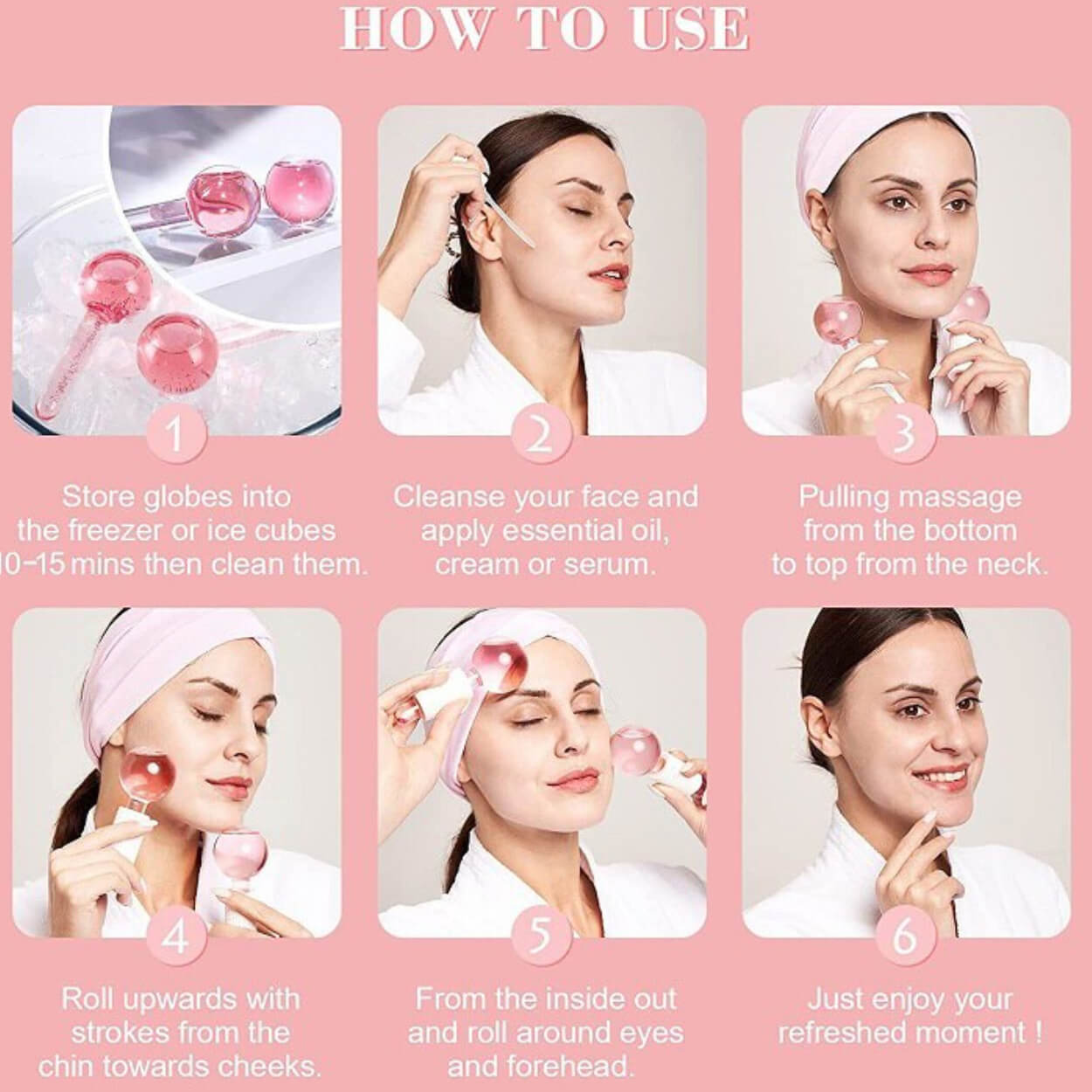 Kylande ice globes är ett hudvårdsverktyg som används för svalkande ansiktsmassage. Förkyl globerna en kort stund i kylskåp och rulla sedan över rengjord hud, gärna tillsammans med serum, olja eller kräm för bättre glid. Den kylande kontakten kan hjälpa till att dämpa svullnad och påsar under ögonen samt lugna rodnad och ge en mer utvilad känsla. Massagen kan även bidra till att huden upplevs jämnare och porer mindre framträdande. Endast för utvärtes bruk och undvik kontakt med ögonen.