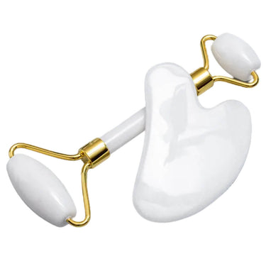 Jade ansiktsroller och gua sha är två verktyg för ansiktsmassage som används för att stimulera cirkulation och ge en svalkande, lugnande känsla mot huden. Rollern passar för jämna drag över kinder, panna och käklinje och kan hjälpa till att minska upplevd svullnad. Gua sha-verktyget används med lätt tryck för mer riktad massage och för att mjuka upp spänningar i ansiktet. Båda delarna är tillverkade av vit jade med slät yta som glider lätt över huden, gärna tillsammans med ansiktsolja eller serum.