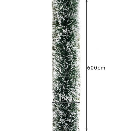 Julgransgirlang på 6 meter som ger ett tätt och fylligt intryck i juldekorationen. Den generösa tjockleken på 15 cm gör att girlangen bygger volym och fungerar som bas för belysning och ornament. Nålarna är tillverkade i PE och sitter på en stabil ram med formbar järntråd inuti, vilket gör den enkel att böja och fästa där den behövs. Passar för montering på gran, trappräcke eller runt fönsterkarm när du vill skapa en tydlig, sammanhållen dekoration.