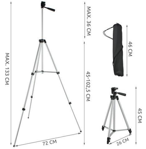Justerbart kamerastativ för mobil och kamera som ger stabilt stöd vid foto och video. Höjden kan ställas från 45 till 133 cm för att passa allt från bordshöjd till stående inspelning. Tre ben ger trygg stabilitet på olika underlag, både inne och ute. Medföljande mobilhållare håller enheten säkert i bredden 55–85 mm. Trådlös fjärrutlösare gör det enkelt att starta foto eller inspelning på avstånd och fungerar med iOS och Android. Förvaringspåse underlättar transport och förvaring.
