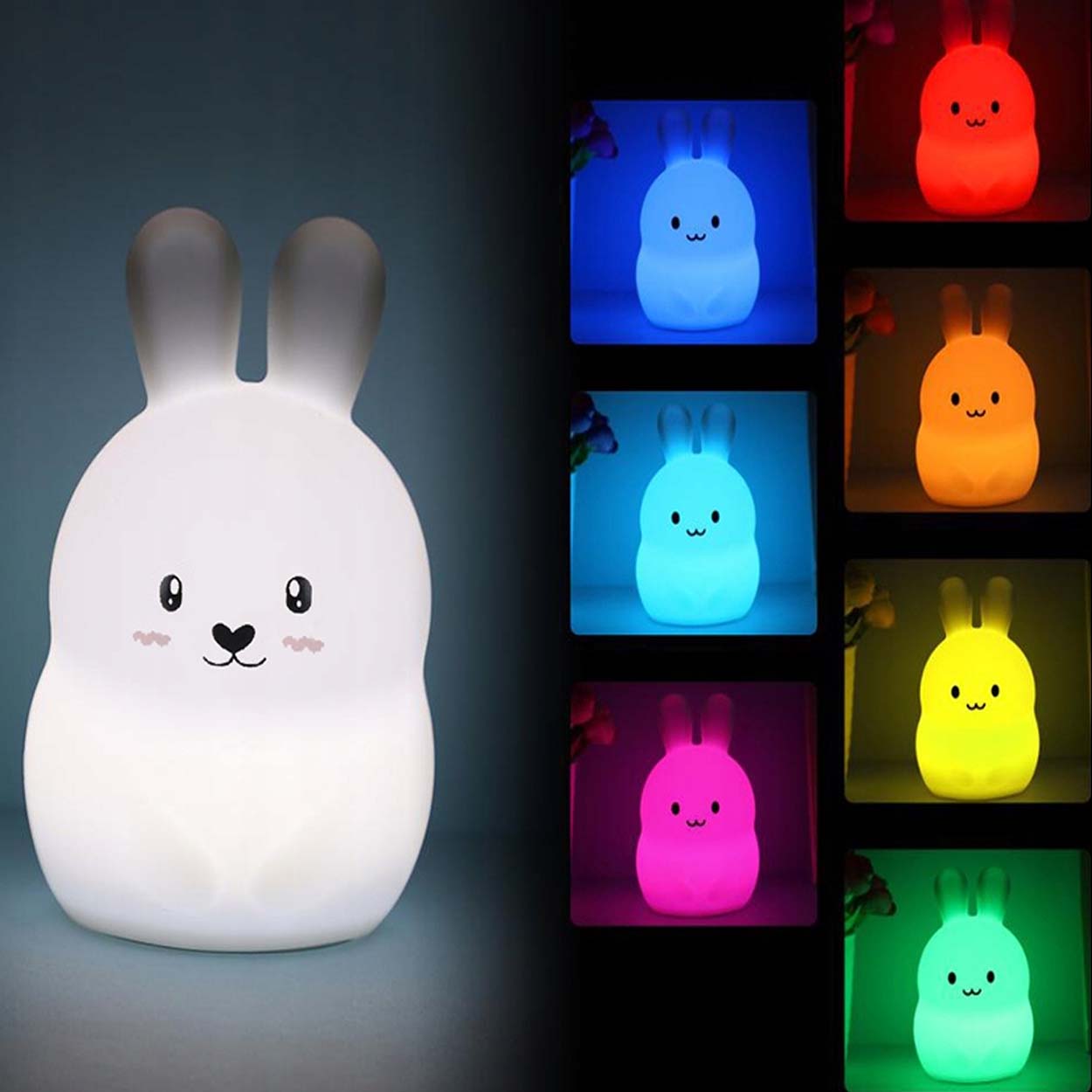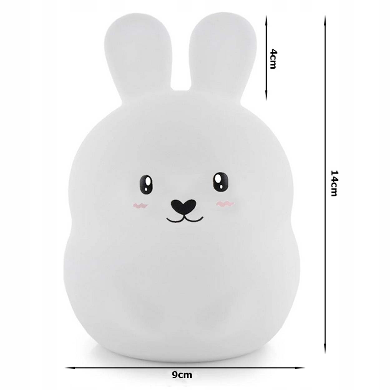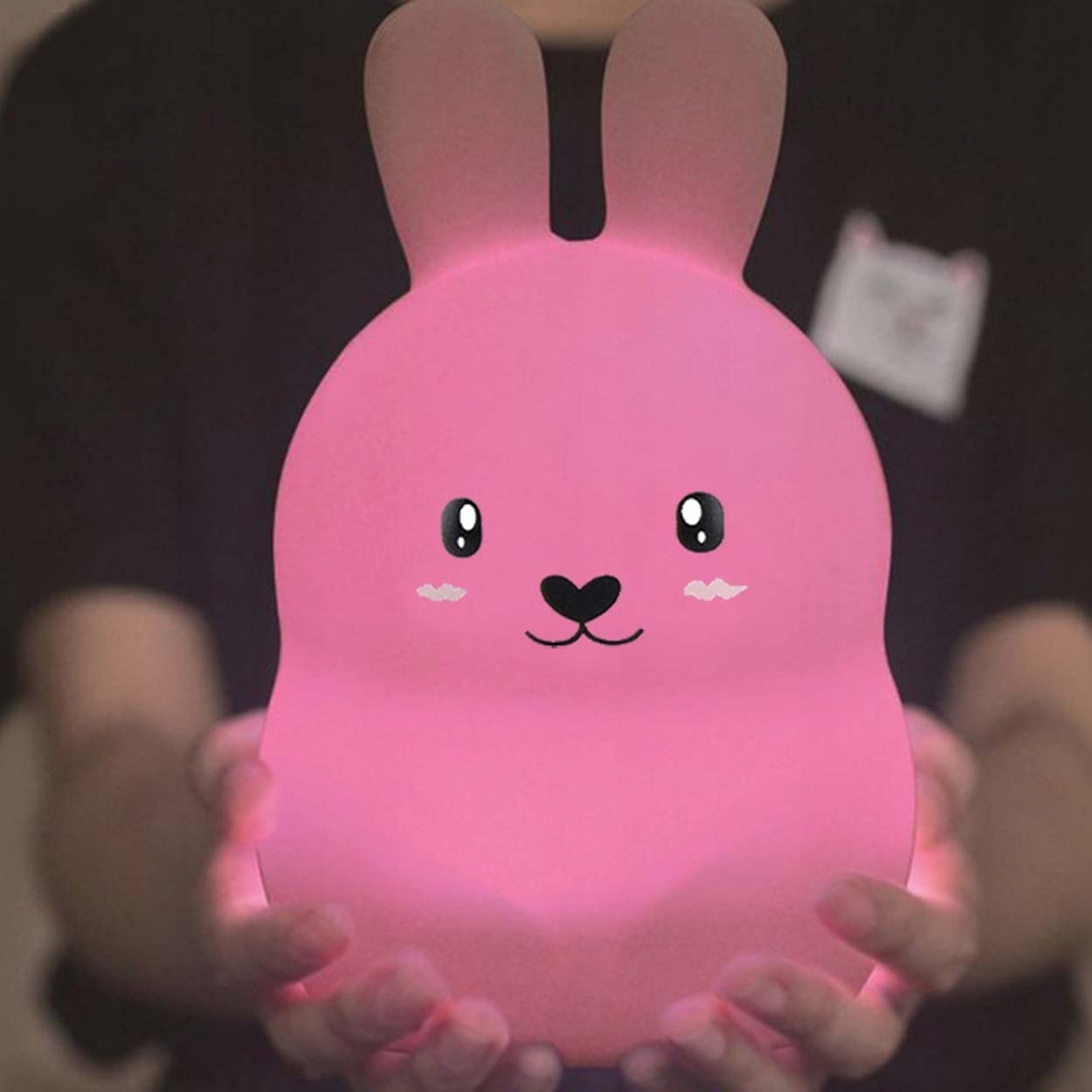 Kanin nattlampa med RGB LED som ger ett mjukt nattljus i barnrummet. Ljuset ändras enkelt genom att trycka på lampan eller via fjärrkontrollen, vilket gör det smidigt att justera utan att störa. Timer kan ställas på 15, 30 eller 60 minuter så att lampan släcks automatiskt vid insomning. Den mjuka silikonkroppen är tålig och behaglig att hålla i, och överdraget kan tas av för enklare rengöring. Laddas via USB och drivs av ett inbyggt uppladdningsbart batteri.