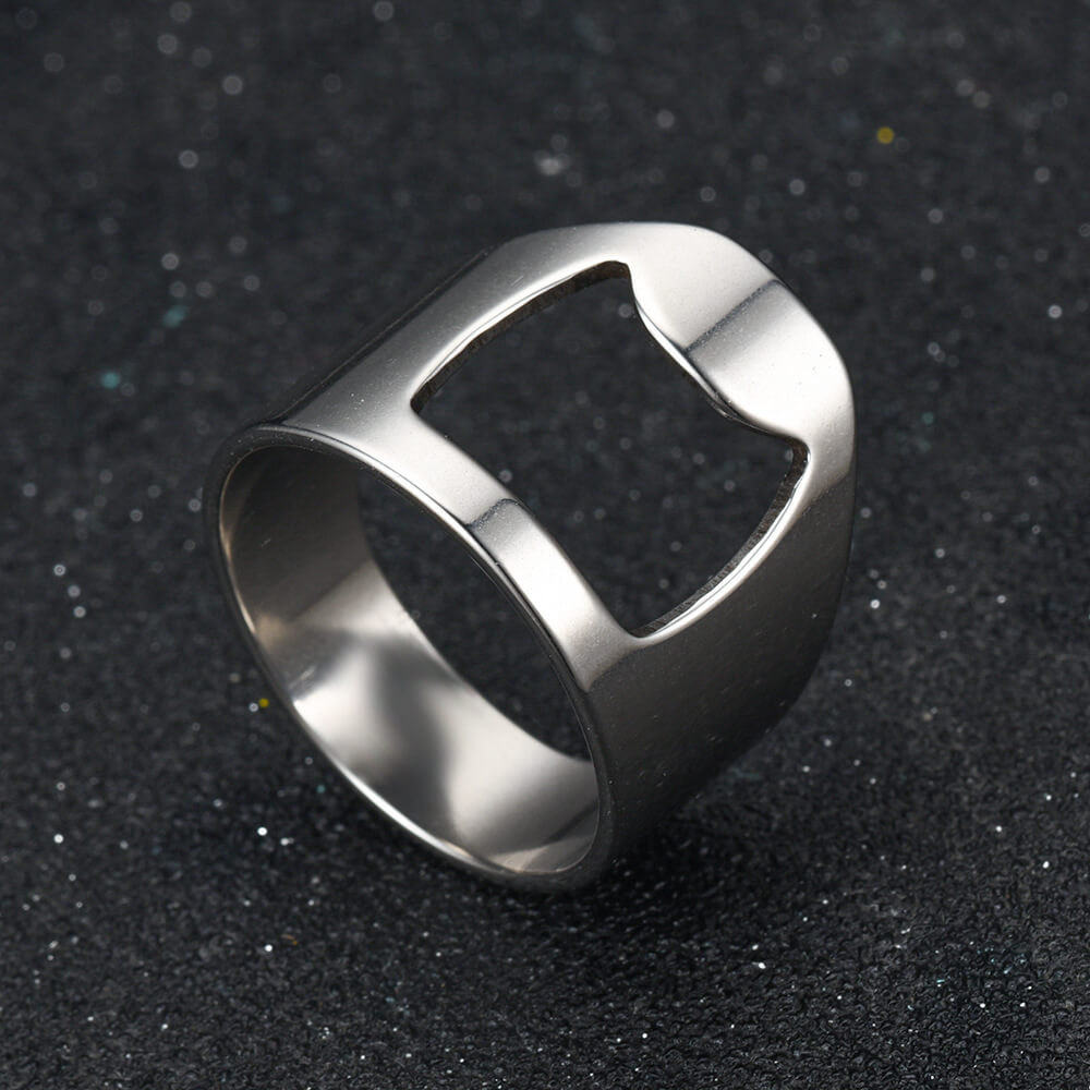 Kapsylöppnarring i rostfritt stål som kombinerar ring och kapsylöppnare i ett. Öppnarfunktionen är integrerad i ringen och gör det enkelt att öppna flaskor med kronkapsyl när en vanlig öppnare saknas. Konstruktionen i rostfritt stål ger en tålig och långlivad produkt som klarar regelbunden användning. Ringen bärs på fingret och är därför lätt att ha med vid grill, fest eller utflykt utan att ta plats i fickan.