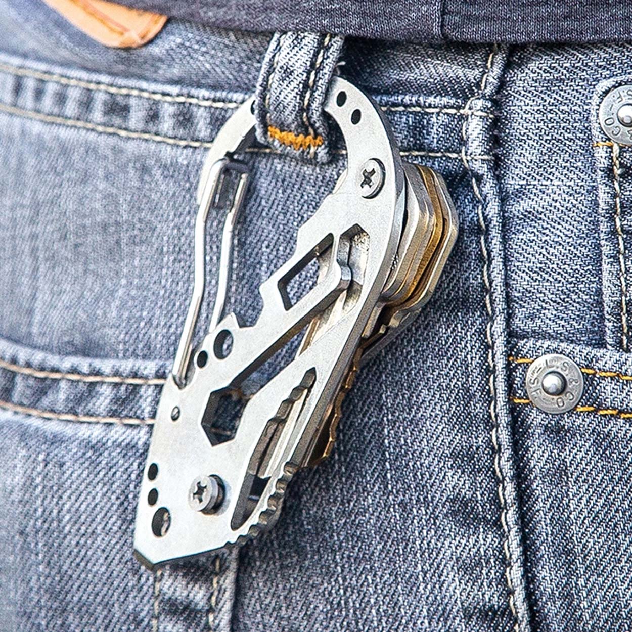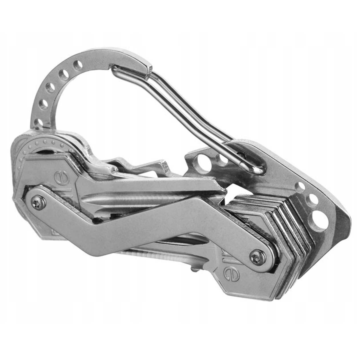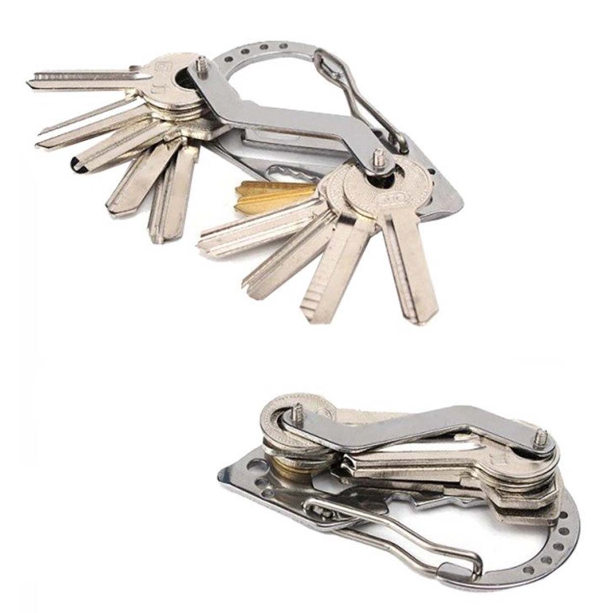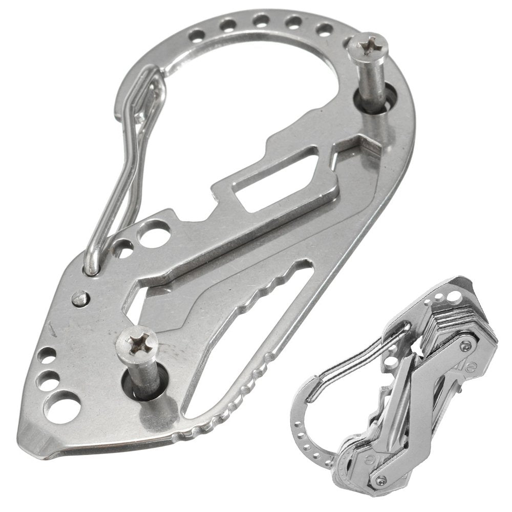 Karbinhake nyckelring multiverktyg i rostfritt stål som samlar flera vardagsfunktioner i ett kompakt format. Verktyget fungerar som nyckelorganisatör och rymmer upp till sex nycklar, samtidigt som karbinhaken gör det enkelt att fästa på bälte, byxa eller väska. Integrerade funktioner som flasköppnare, skruvmejsel och skiftnyckel ger snabb hjälp vid småfix hemma, på jobbet eller under friluftsaktiviteter. Laser-skuren konstruktion ger en precis form och stabil känsla i handen.