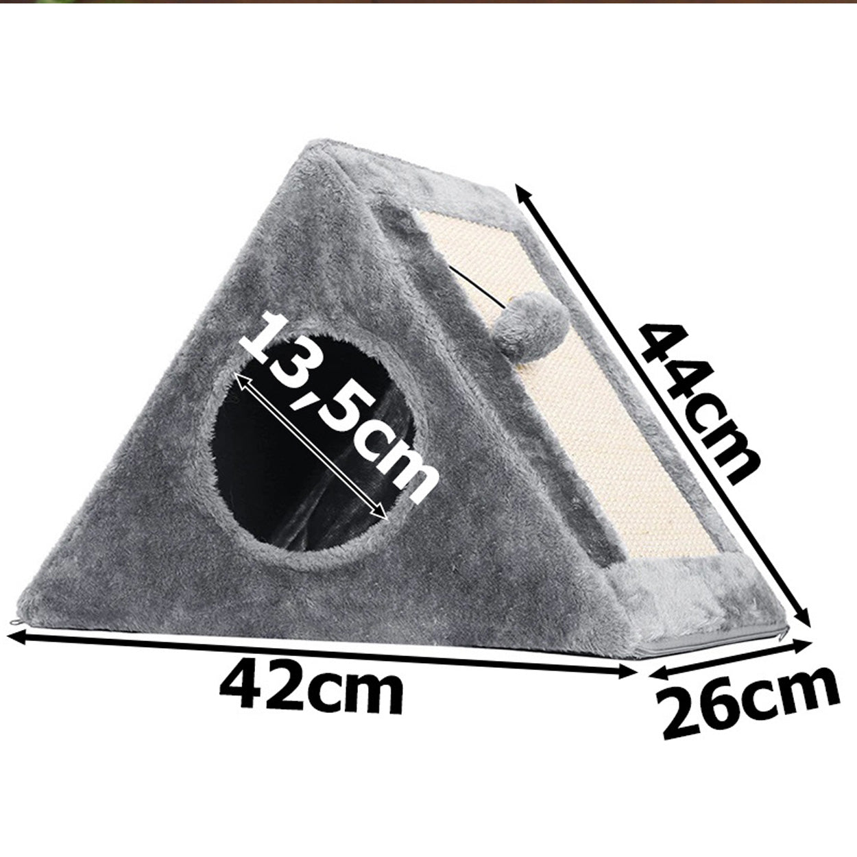 Kattkoja / klösbräda – vila, klös, lek – hängande boll, triangelform