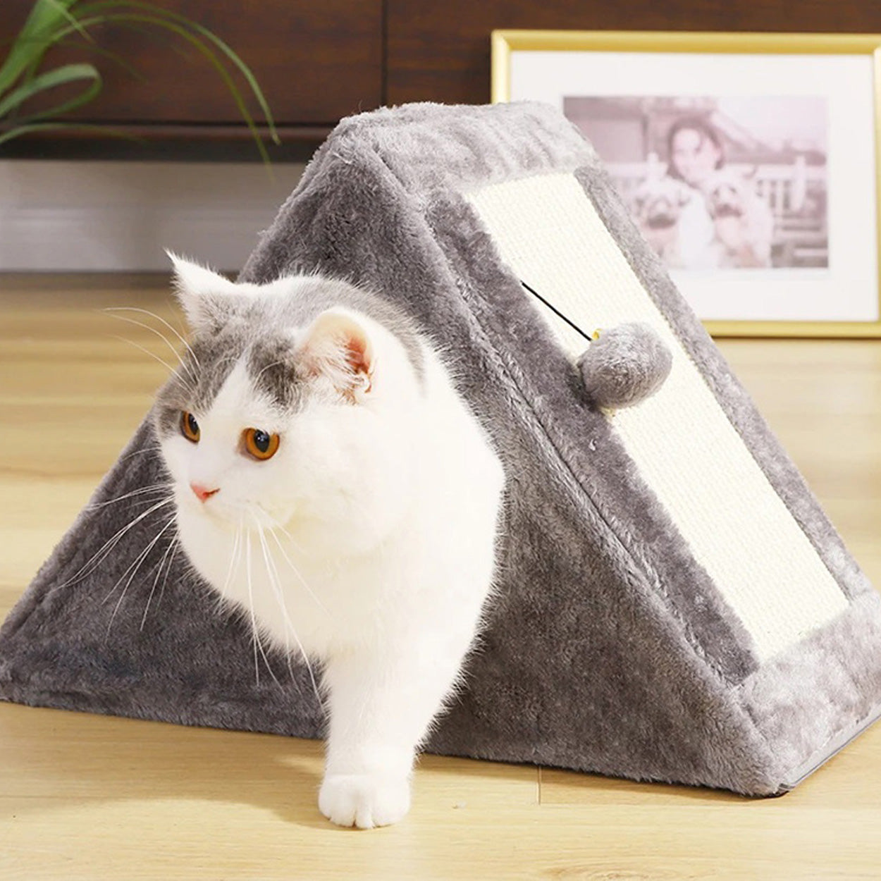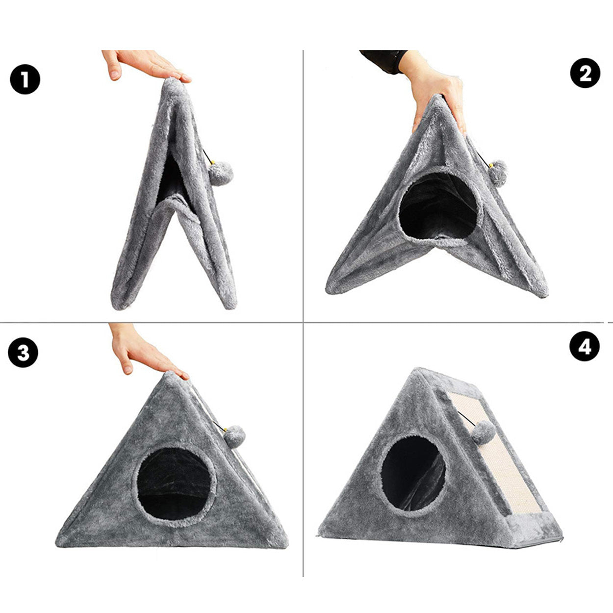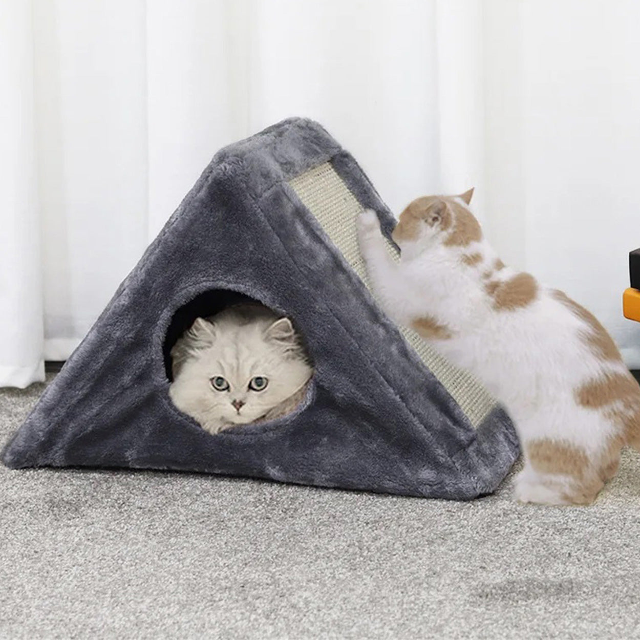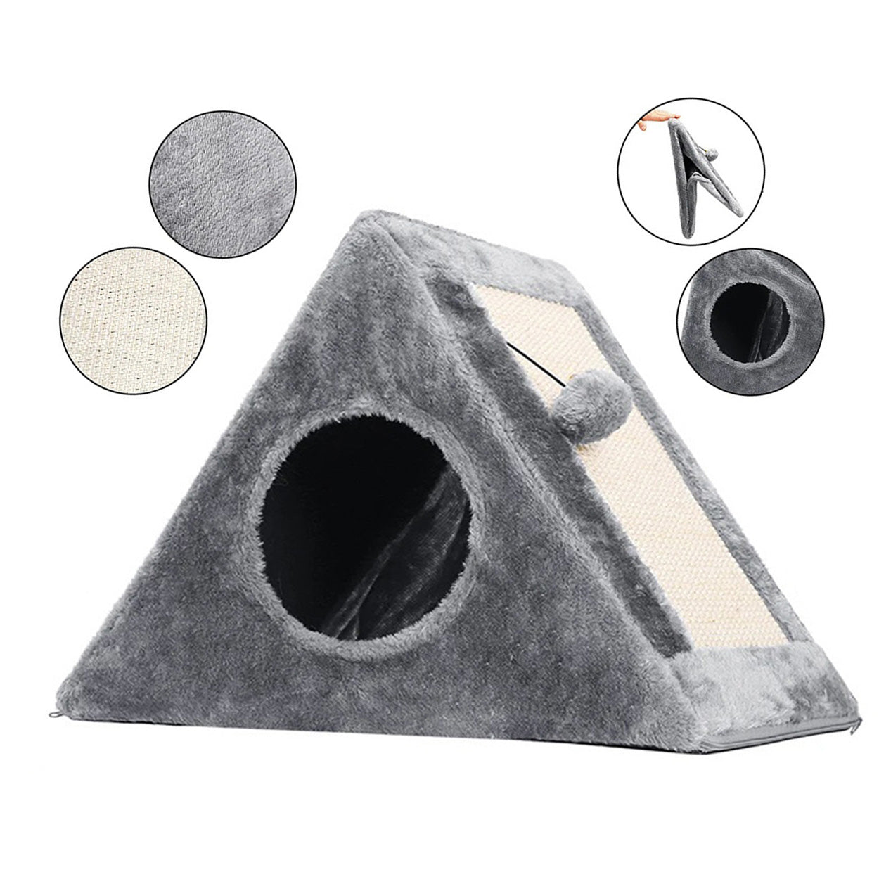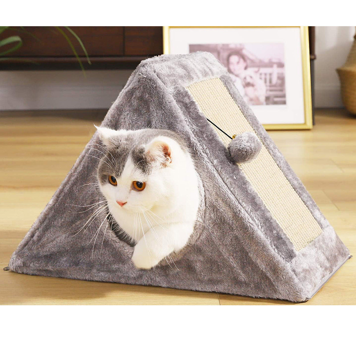 Kattkoja och klösbräda i triangelform som kombinerar viloplats, klösyta och lek i samma produkt. Den stabila konstruktionen ger en trygg koja där katten kan krypa in och vila, samtidigt som klösytan hjälper till att hålla klorna i trim. Inuti hänger en boll som lockar till lek och aktivering utan extra tillbehör. Passar bra för nyfikna katter som vill växla mellan att gömma sig, klösa och leka. Monteras enkelt och tar liten plats i hemmet.