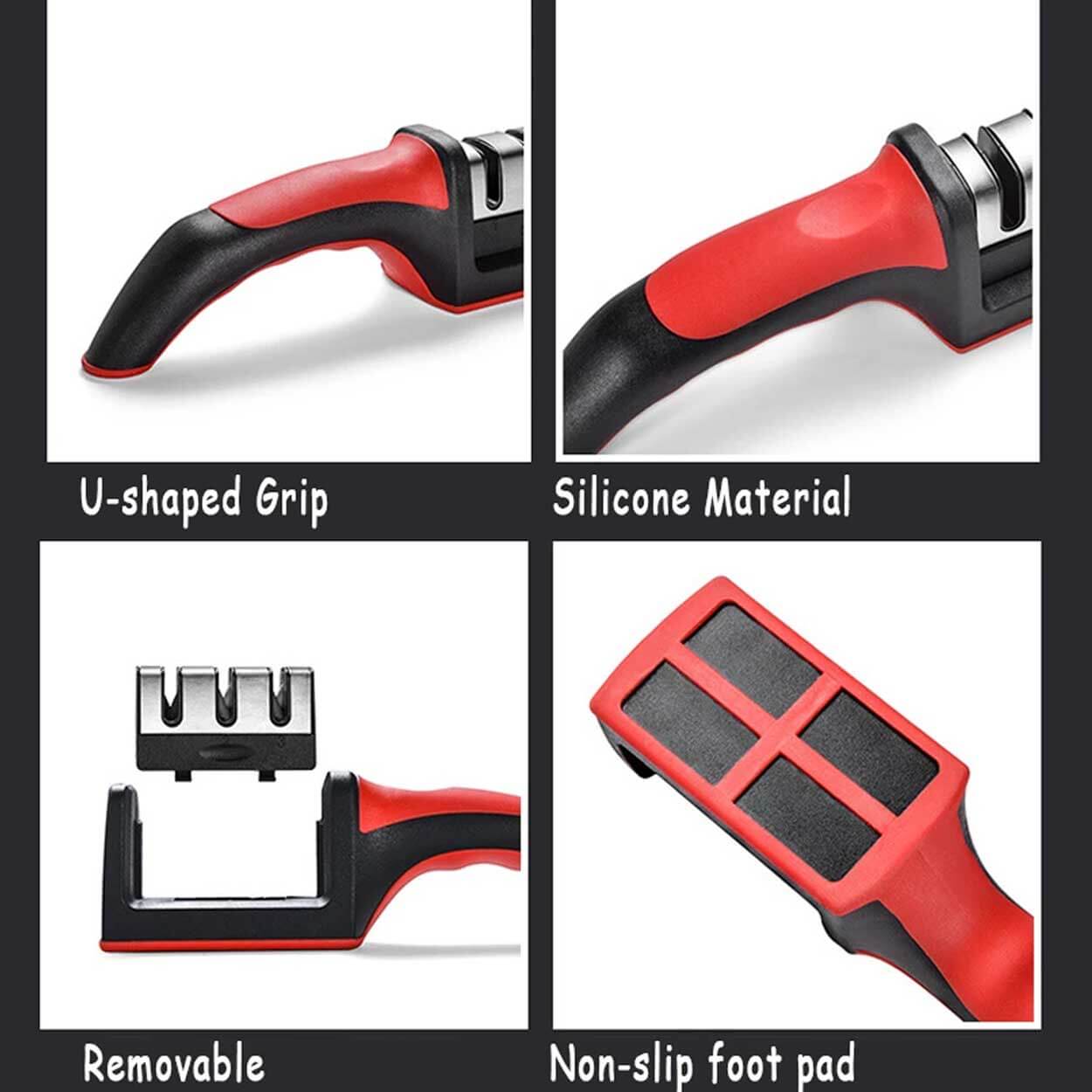 Knivslip med fyra slipsteg som hjälper till att hålla köksknivar och saxar vassa hemma. Välj spår efter behov: daglig uppfräschning, grovslipning och finslipning, samt ett läge anpassat för keramiska knivar. Handtaget är ergonomiskt utformat för ett stabilt grepp och undersidan har halkskydd som håller slipen på plats på köksbänken. Sliphuvudet kan tas av för smidig rengöring efter användning.