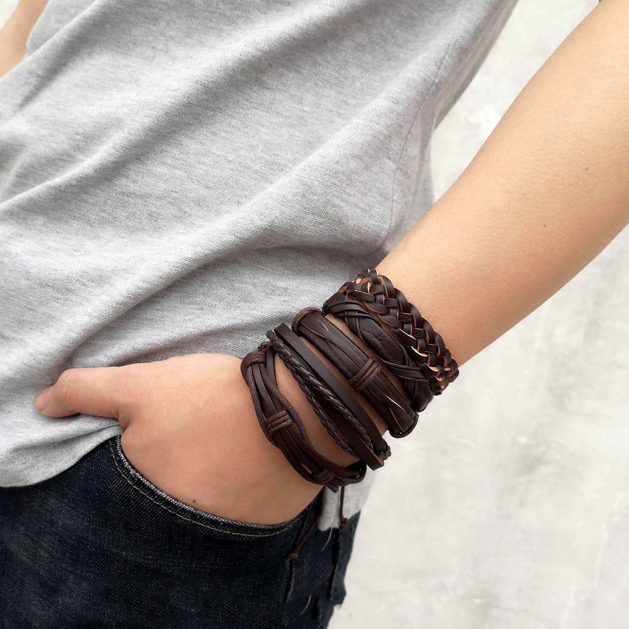 Läderarmband i 5-pack för herr som ger enkel variation i vardagsstilen. Armbanden är handgjorda i läder och har justerbar längd så att passformen kan anpassas efter handledens omkrets. Setet gör det lätt att bära ett armband för en diskret look eller kombinera flera samtidigt. Passar som handledssmycken till både vardagskläder och mer uppklädda tillfällen när du vill addera en tydlig detalj utan att det tar över.