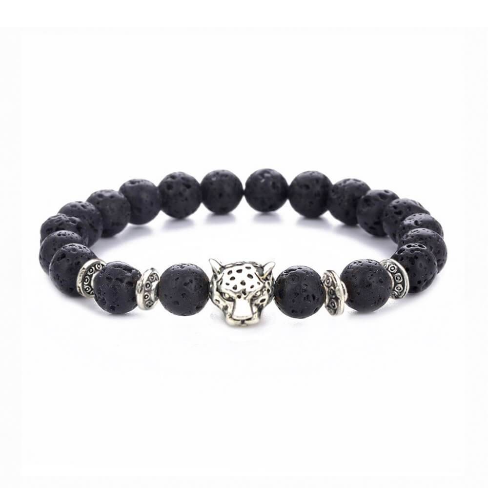 Handgjort herrarmband med lavastenpärlor och ett leopardhuvud i metall. Pärlorna har 8 mm diameter och ger ett tydligt stenuttryck utan att kännas klumpigt på handleden. Stretchkonstruktionen gör armbandet enkelt att ta på och ger en följsam passform vid daglig användning. Längden är 19–20 cm, vilket passar många handleder. Ett armband som fungerar lika bra ensamt som tillsammans med klocka eller andra armband.