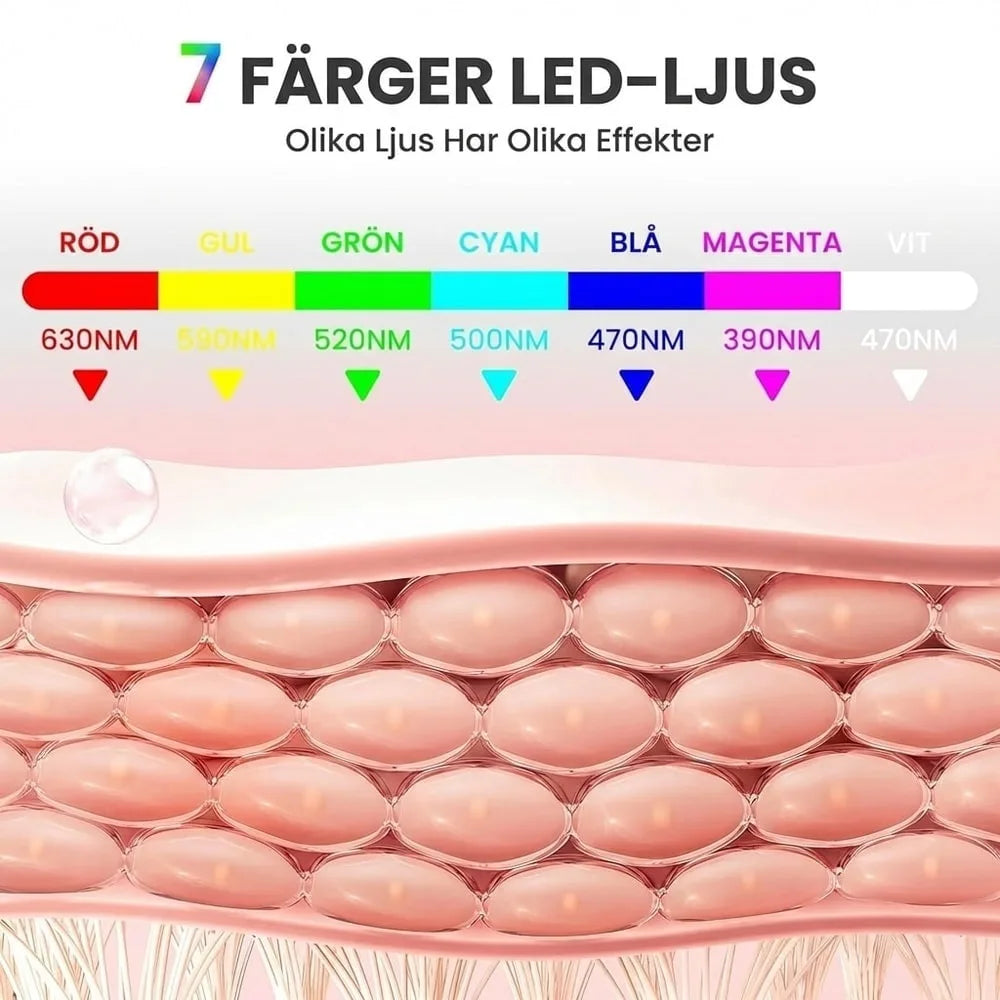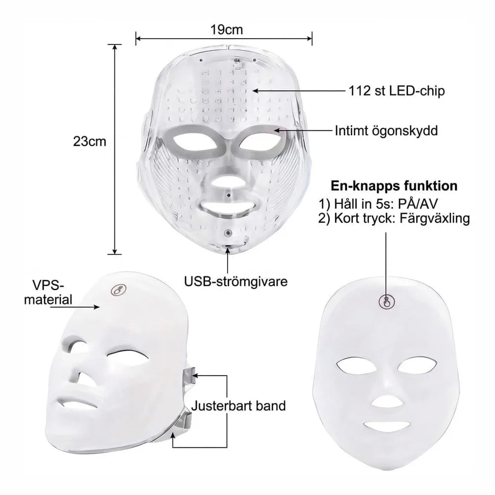 LED ljusterapimask för ansiktet som används i hemmarutinen för riktad hudvård. Masken är uppladdningsbar och har 7 ljusfärger med angivna våglängder för olika behov. Rött ljus 630 nm används för ett fastare och slätare intryck, blått ljus 470 nm för aknebenägen hud, gult 590 nm för jämnare ton och grönt 520 nm för att balansera intrycket av oljig hud. Rekommenderad behandlingstid är 15 minuter och intensiteten kan justeras i tre nivåer. Tillverkad i silikon för mjuk passform mot huden.